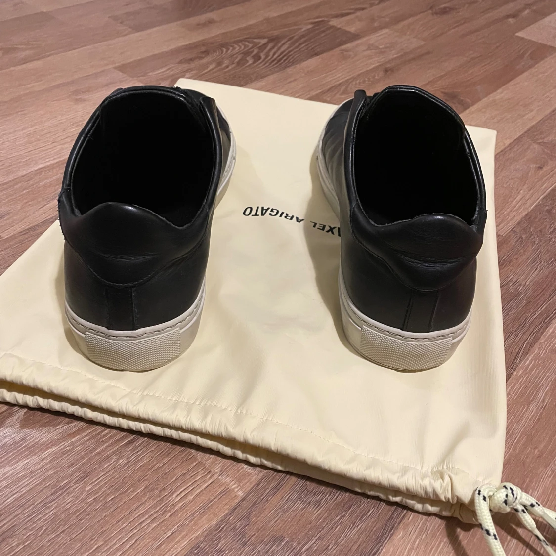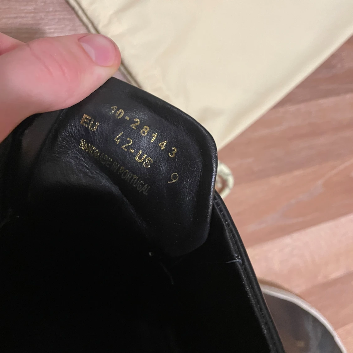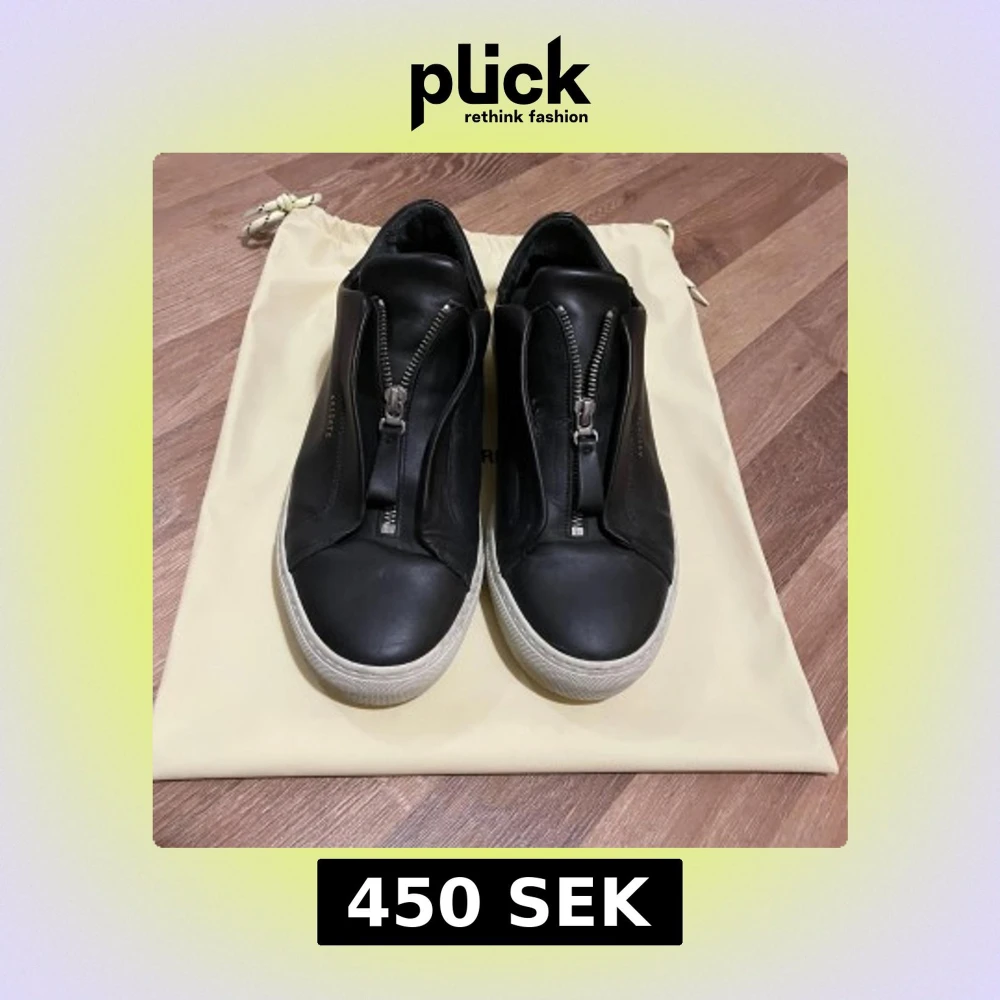 Ett par svarta arigatos i med dragkedja och i läder. Använda ganska flitigt men har försökt fräscha upp dem. Det finns två defekter på samma ställe som syns på på bild 4 & 5. Jag lagat en av sidorna med lim. Storlek 42 och på grund av det använda skicket säljer jag dessa till ett väldigt lågt pris, kan även tänka mig att sänka lite:) original påse medföljes.