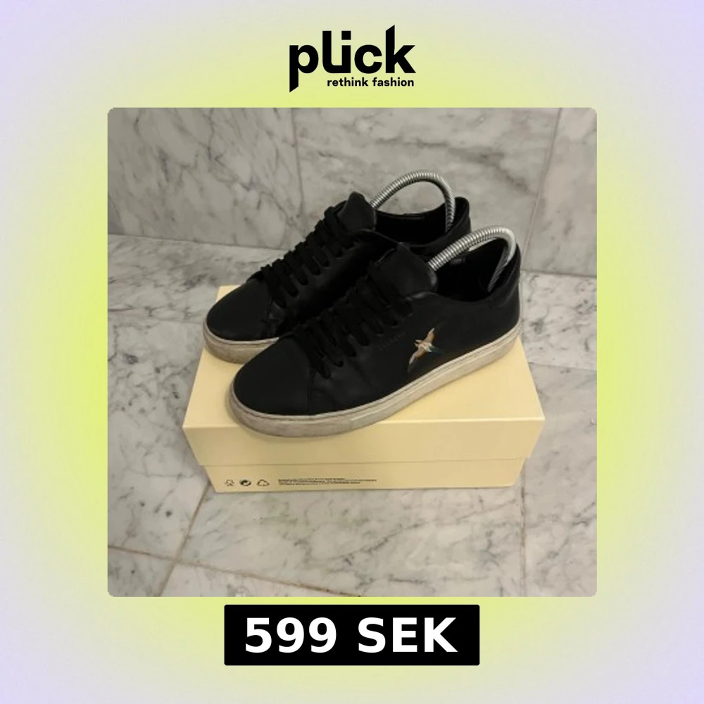 Snygga svarta sneakers från Axel Arigato med en broderad fågel på sidan. Skorna har en klassisk design med snörning och en vit. Skick 9/10 förutom att hälen på skon är lite slapp men sparsamt använda, nypris runt 2500kr. Pris kan diskuteras vid snabb affär