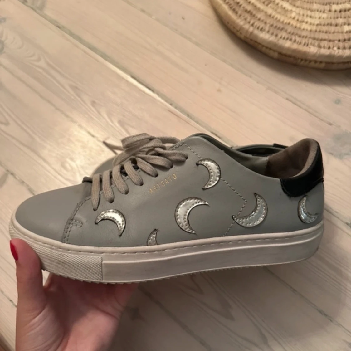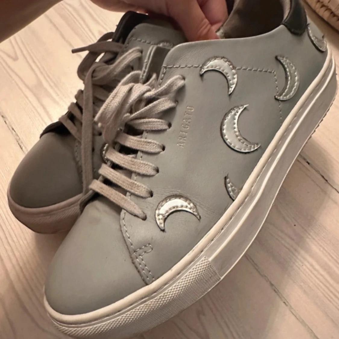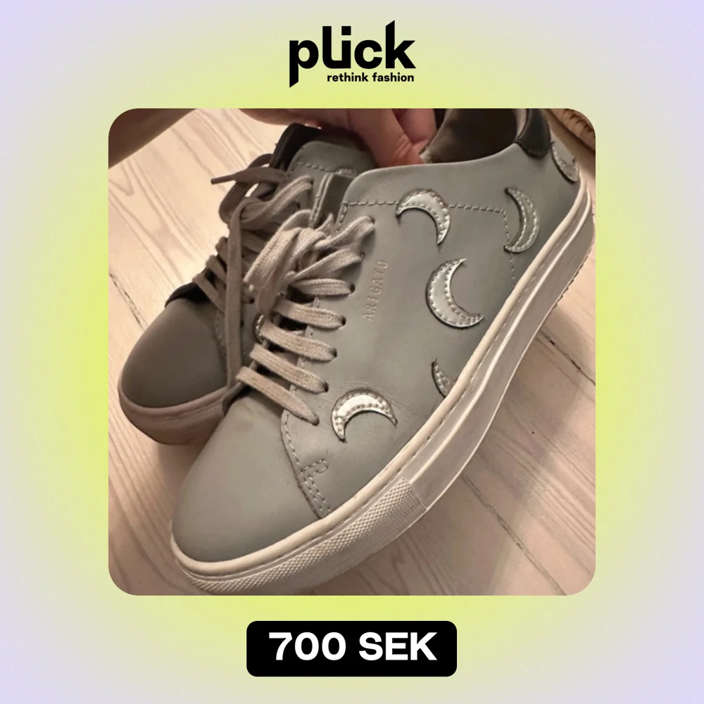 Använda Max 4 gånger ! Pris kan diskuteras! Snygga grå sneakers från Axel Arigato med coola silverfärgade måndetaljer. Perfekta för både vardag och festliga tillfällen. De är i mycket bra skick!!