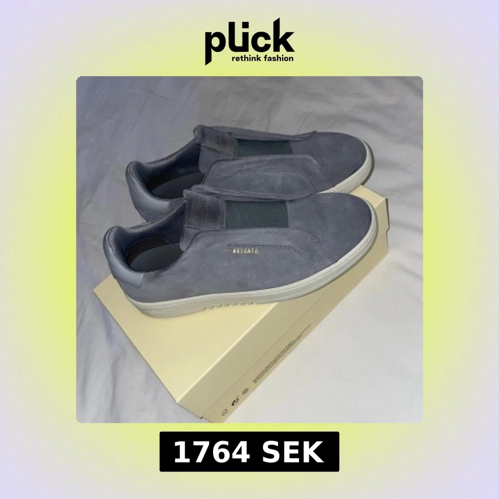 Snygga grå sneakers från Axel Arigato i mocka med elastiskt band över vristen och diskret guldfärgad logga på sidan. Skorna har en vit platt sula och rund tå, perfekt för en clean och stilren look.