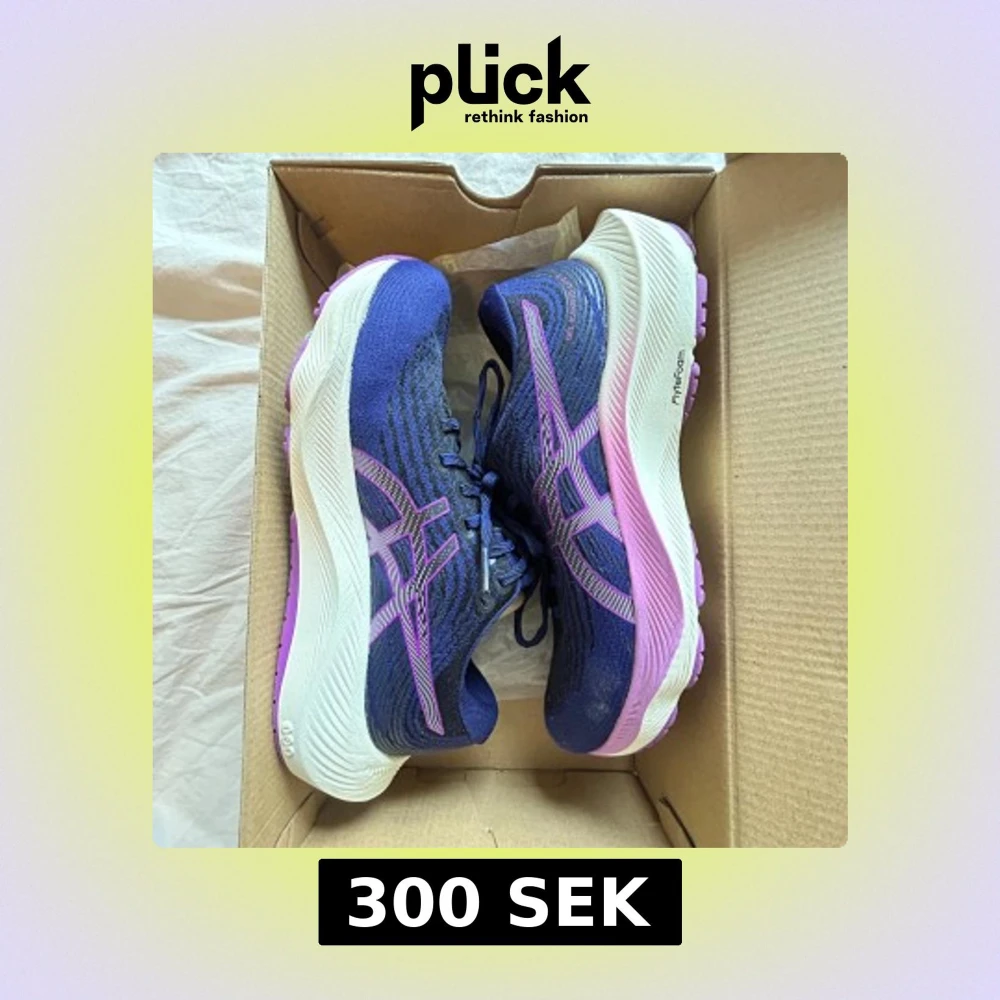 Snygga löparskor från Asics i en kombination av blått och lila med vita detaljer. Skorna har en bekväm passform och är perfekta för träning. De har snörning och en dämpande sula för extra komfort.