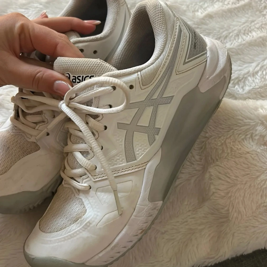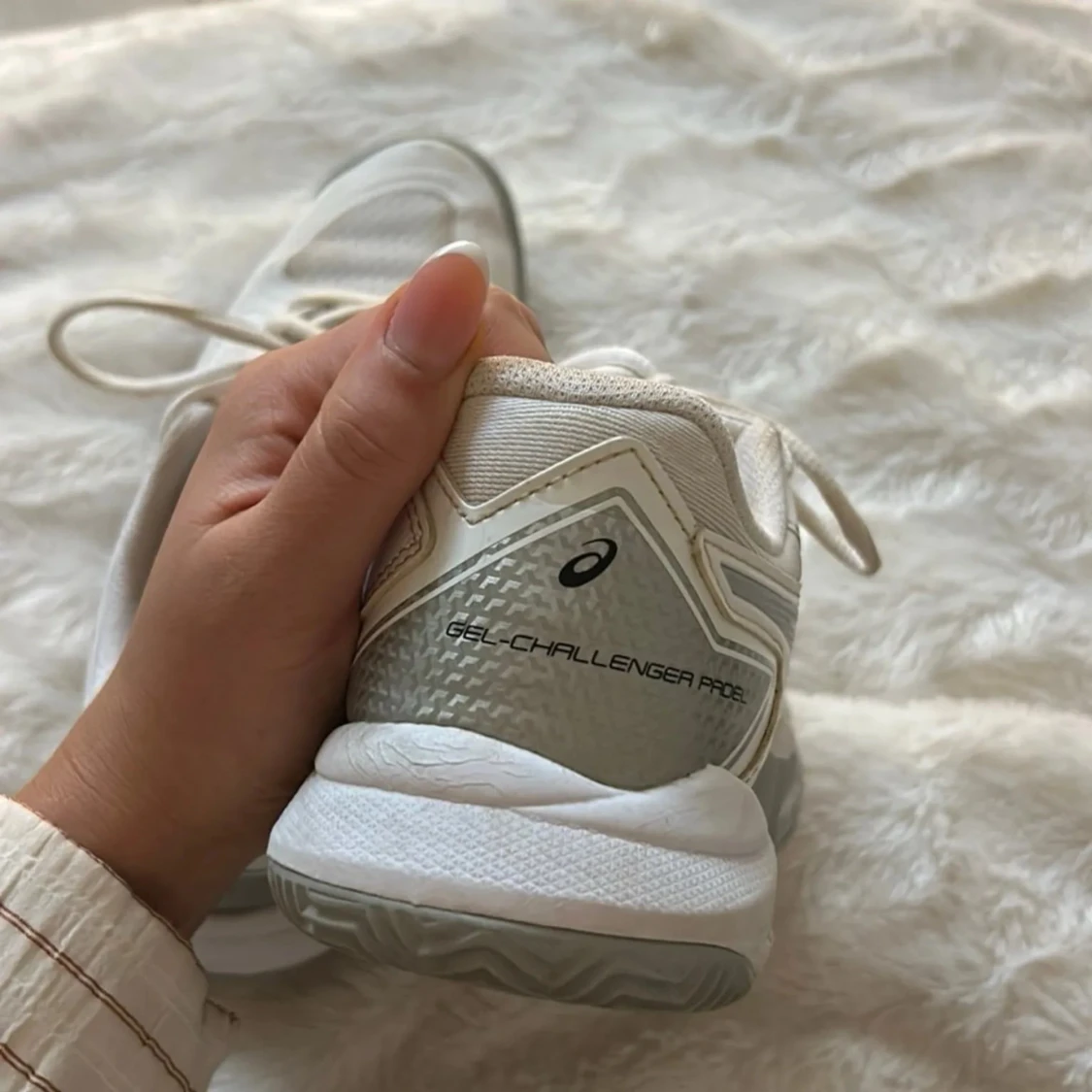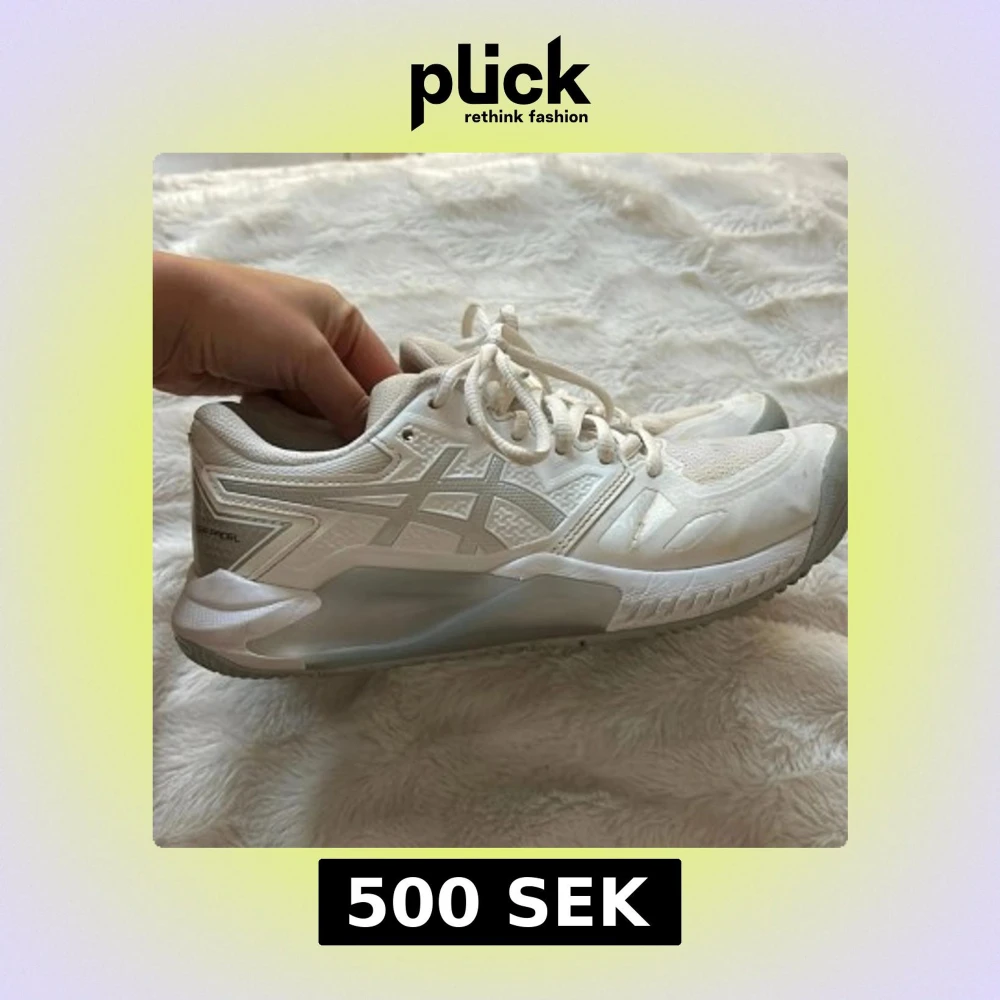 Snygga vita Asics Gel-Challenger sneakers med snörning och grå detaljer. Perfekta för sport och träning med en bekväm passform och slitstark sula.