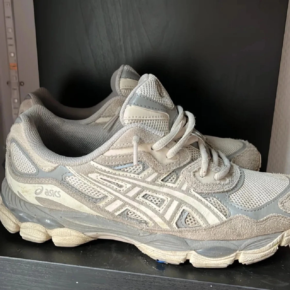 Säljer ett par gråa Asics sneakers med vit logga och detaljer. Skorna har snörning och en platt sula, tillverkade i en mix av syntet och mocka. Perfekta för dig som gillar sportig stil och vill ha bekväma skor till vardagen.