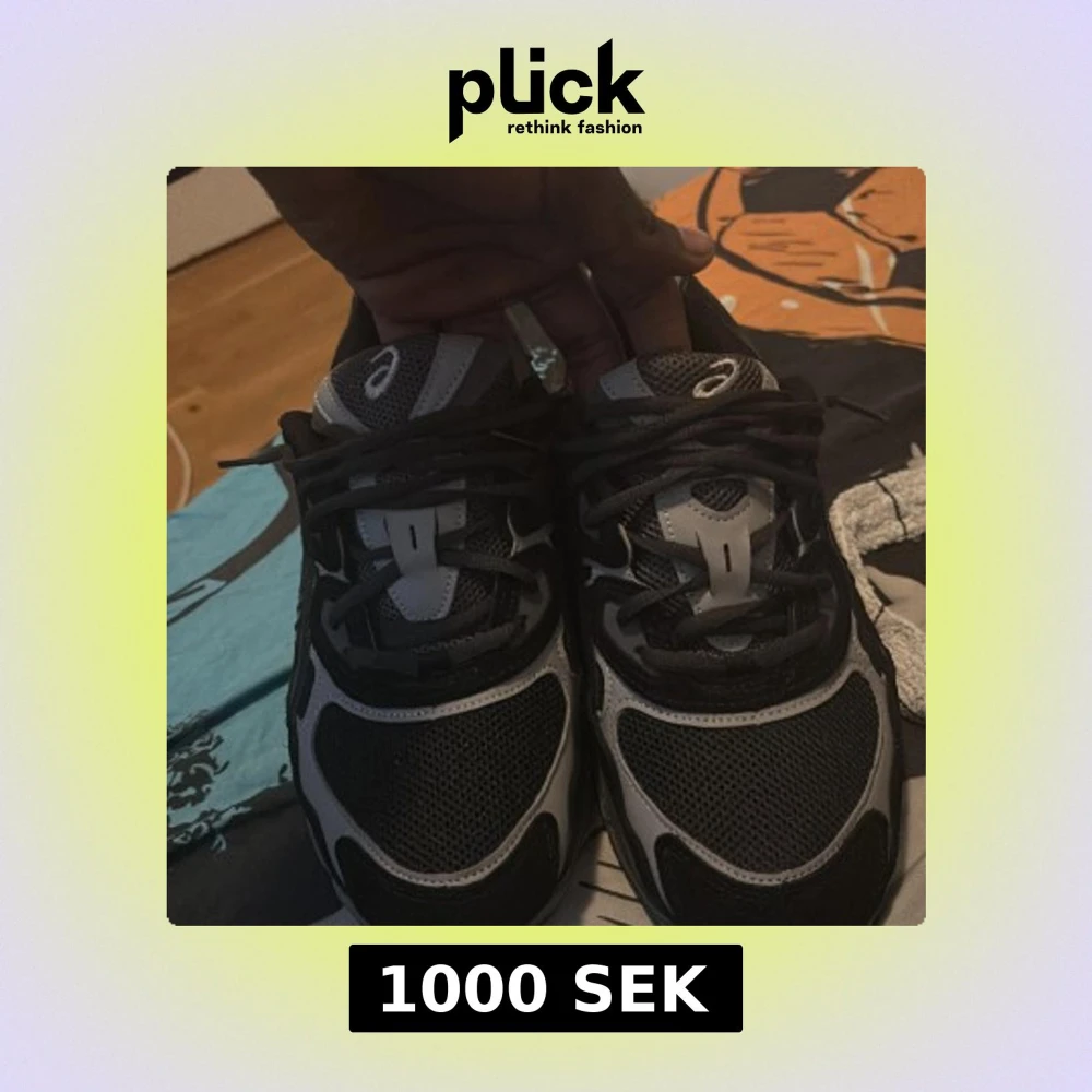 Säljer ett par snygga Asics sneakers i svart och grått med coola detaljer och meshpaneler för extra andningsförmåga. Skorna har snörning och en rejäl, sportig sula som ger bra komfort. Perfekta för dig som gillar streetwear och sportig stil.