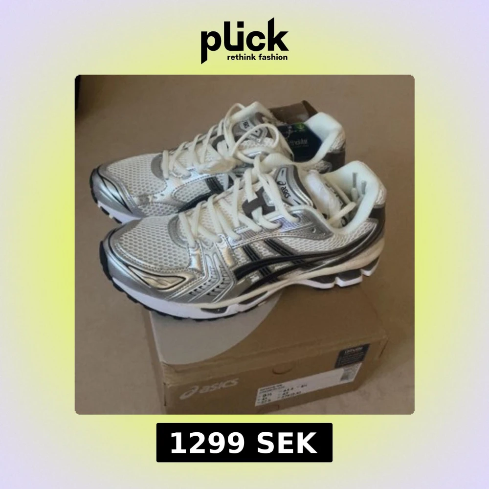 Säljer ett par Asics Gel-Kayano 14 sneakers i silver och vitt med svarta detaljer. Skorna har meshpaneler för ventilation, snygga reflekterande partier och klassisk snörning. Platt sula och rund tå ger en sportig vibe, perfekt för dig som gillar retrostil och komfort.