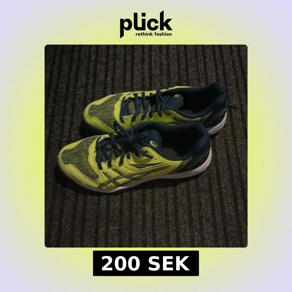 Säljer ett par Asics tennisskor i en fräsch gul och mörkblå färgkombination. Skorna har snörning, platt sula med fiskbensmönster och är tillverkade i syntetmaterial och mesh för bra andningsförmåga. som nya