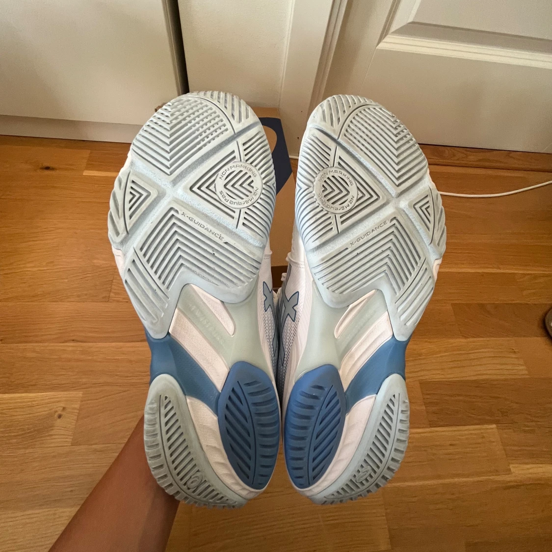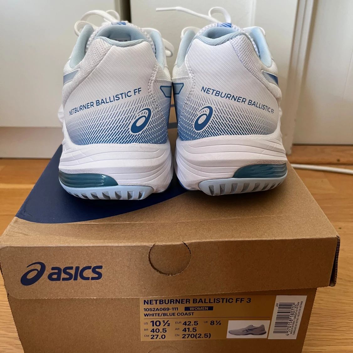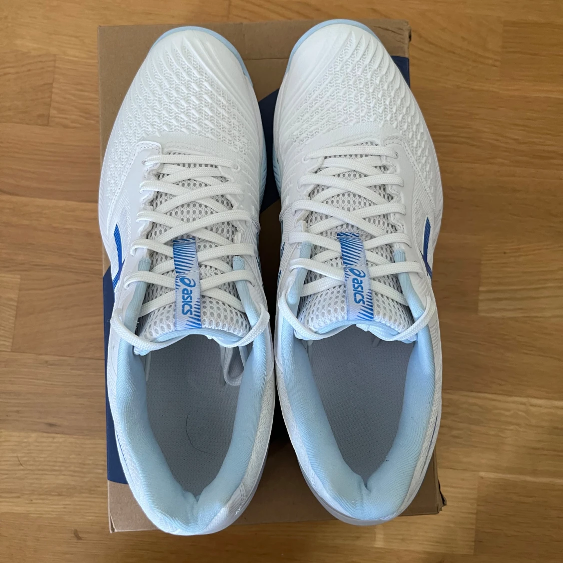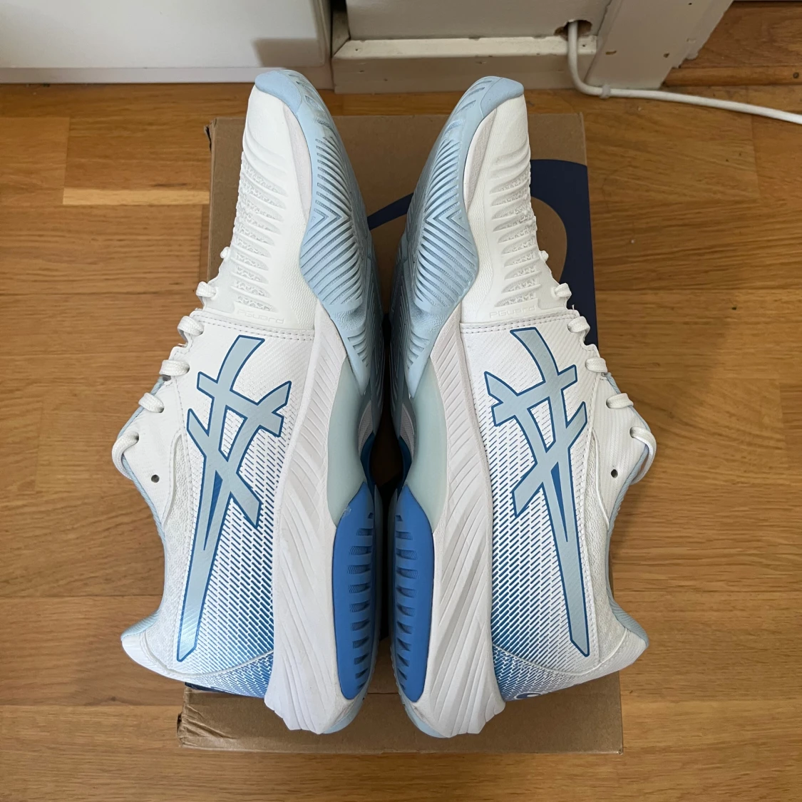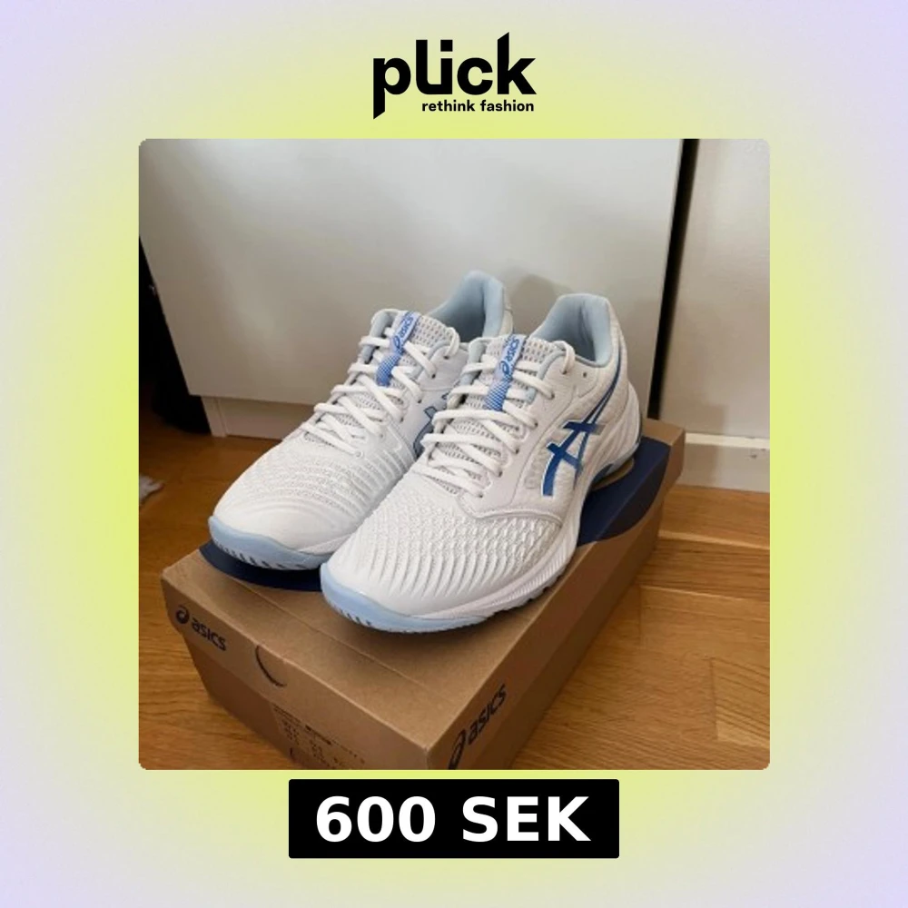 Säljer nu mina Asics skor i extremt fint skick. Skorna är endast använda 4 gånger. Skorna är damskor i storlek 42.5 men sitter även som herrskor i storlek 42. De är inomhusskor och passar perfekt till alla möjliga inomhussporter. Till exempel innebandy, paddel och volleyboll. Nypris 1500kr. Orginal box tillkommer. Vid frågor eller funderingar är det bara att höra av sig😊.