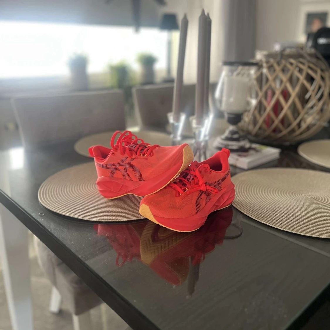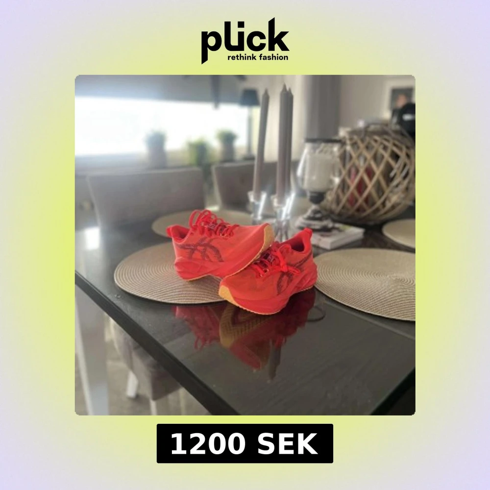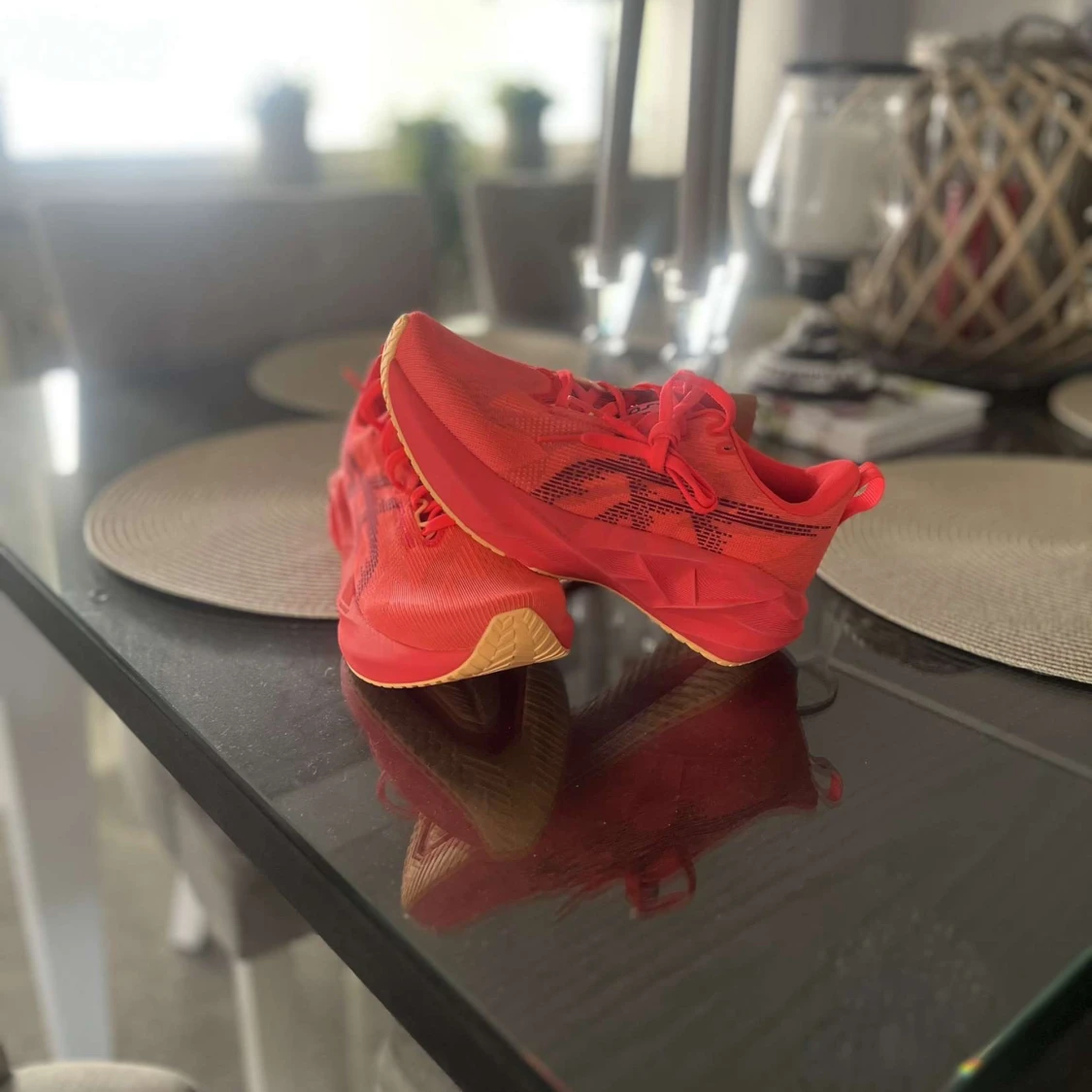 Säljer ett par riktigt snygga Asics sneakers i röd färg med svarta detaljer. Skorna har en sportig design med mesh-ovandel, snörning och en tjock, platt sula i rött och beige. Perfekta för dig som gillar att sticka ut och vill ha grym komfort till träningen.
