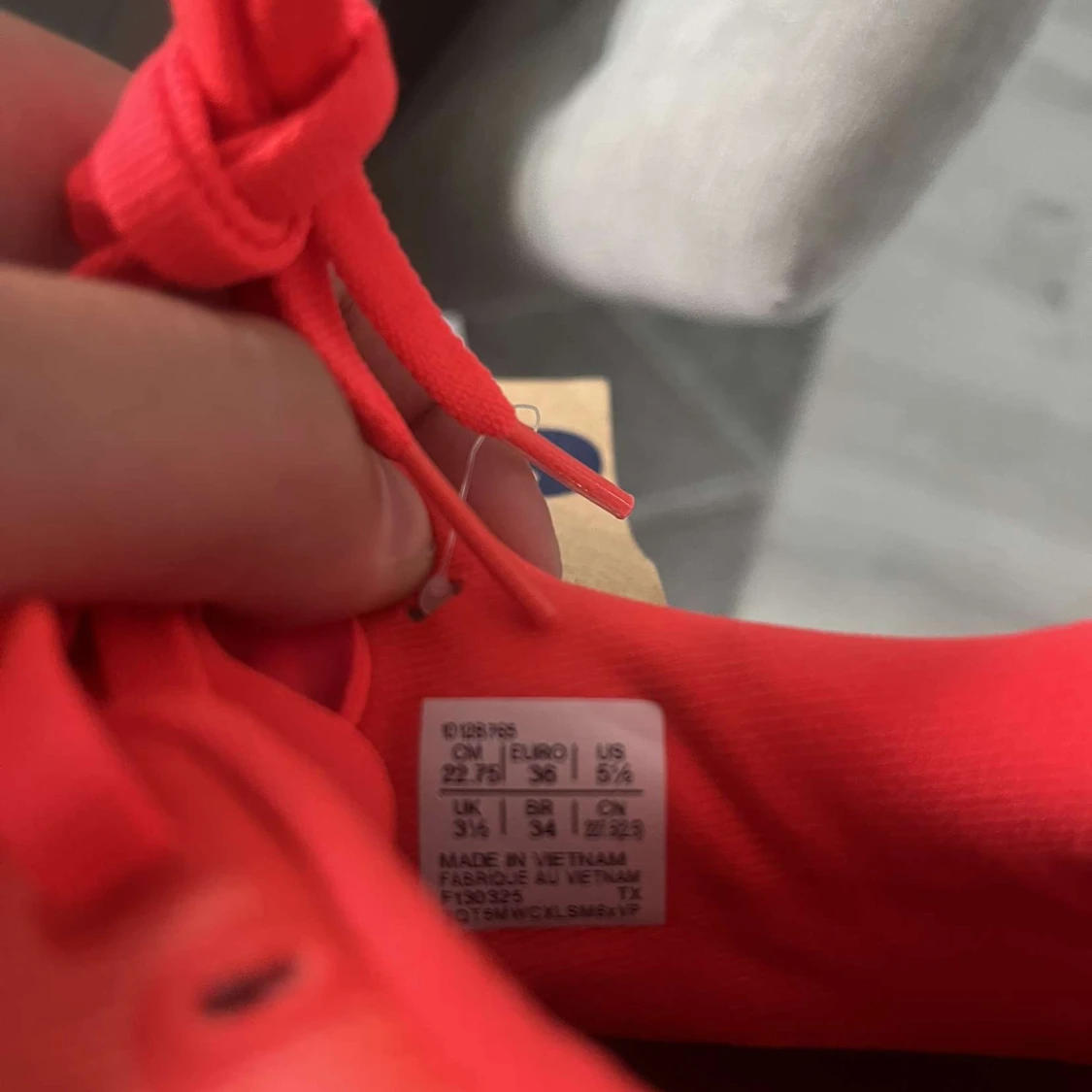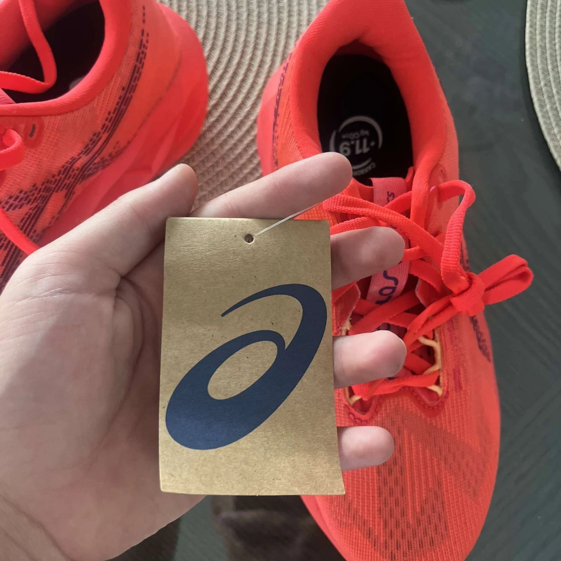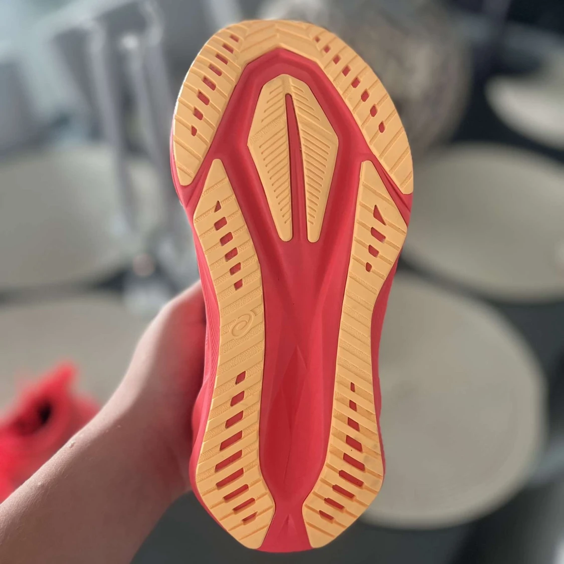 Säljer ett par riktigt snygga Asics sneakers i röd färg med svarta detaljer. Skorna har en sportig design med mesh-ovandel, snörning och en tjock, platt sula i rött och beige. Perfekta för dig som gillar att sticka ut och vill ha grym komfort till träningen.