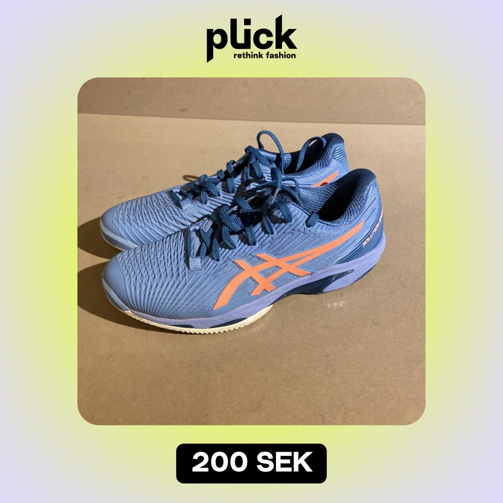 Säljer ett par Asics Solution Speed FF i blått med orange detaljer. Skorna har en snygg och sportig design med snörning och en slitstark sula perfekt för tennis. De är i mycket bra skick och redo för nya äventyr på banan!