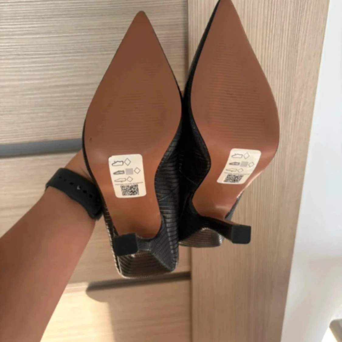 Säljer ett par svarta pumps med hög klack och spetsig tå. Skorna har ett stilrent, diskret mönster i materialet som ger en lyxig känsla. Tillverkade i skinnimitation med en elegant finish, perfekta för dig som vill sticka ut med klassiska men trendiga klackar.