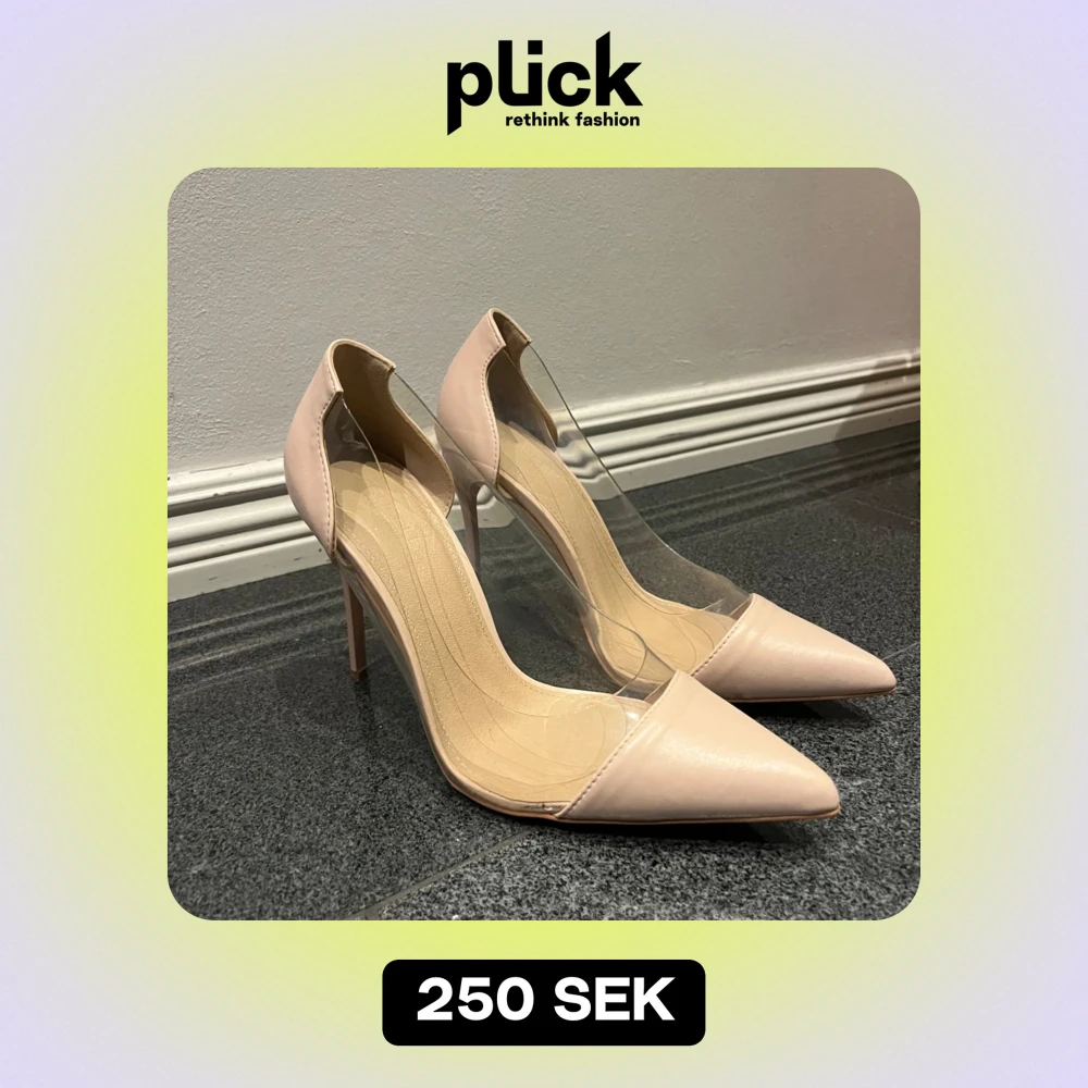 Säljer ett par eleganta beige pumps med spetsig tå och transparenta sidor. Perfekta för en utekväll eller fest! De har en stilren design med hög klack som ger en snygg siluett. Helt oanvända! Passar perfekt till både klänning och byxor.