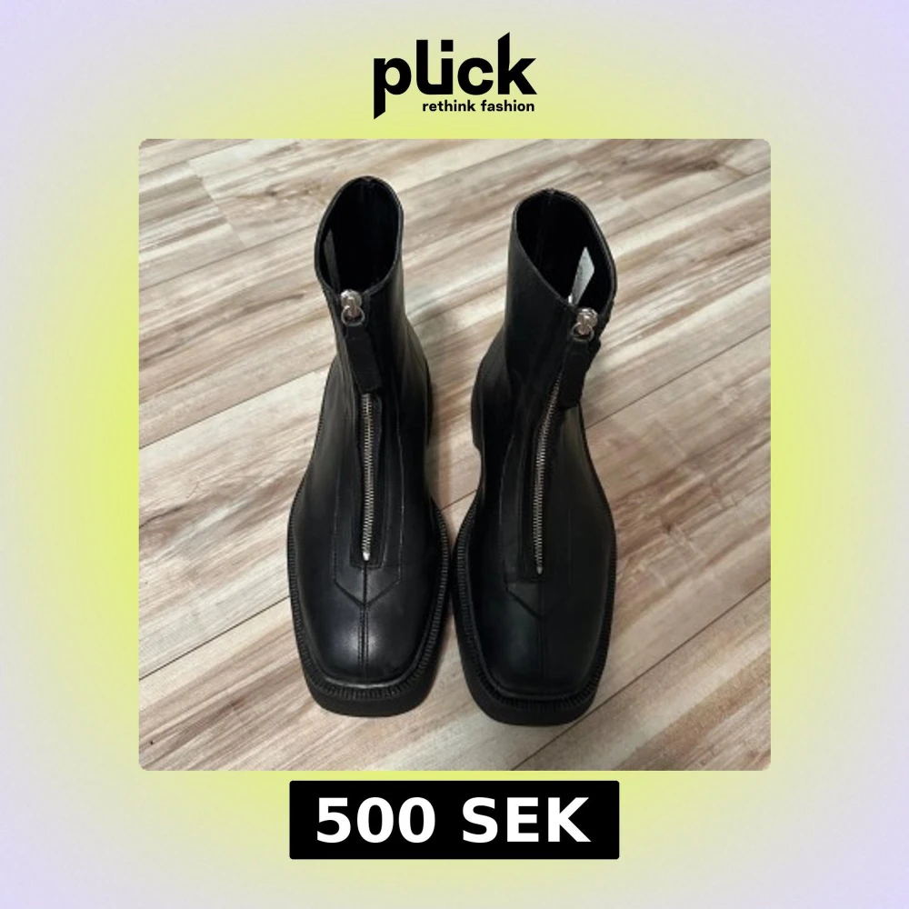 Svarta boots i skinn från ASOS med chunky platt sula och fyrkantig tå. Dragkedja framtill ger en edgy vibe och gör dem lätta att ta på. Tillverkade i Portugal, stilrena och passar perfekt till streetwear eller en clean look.