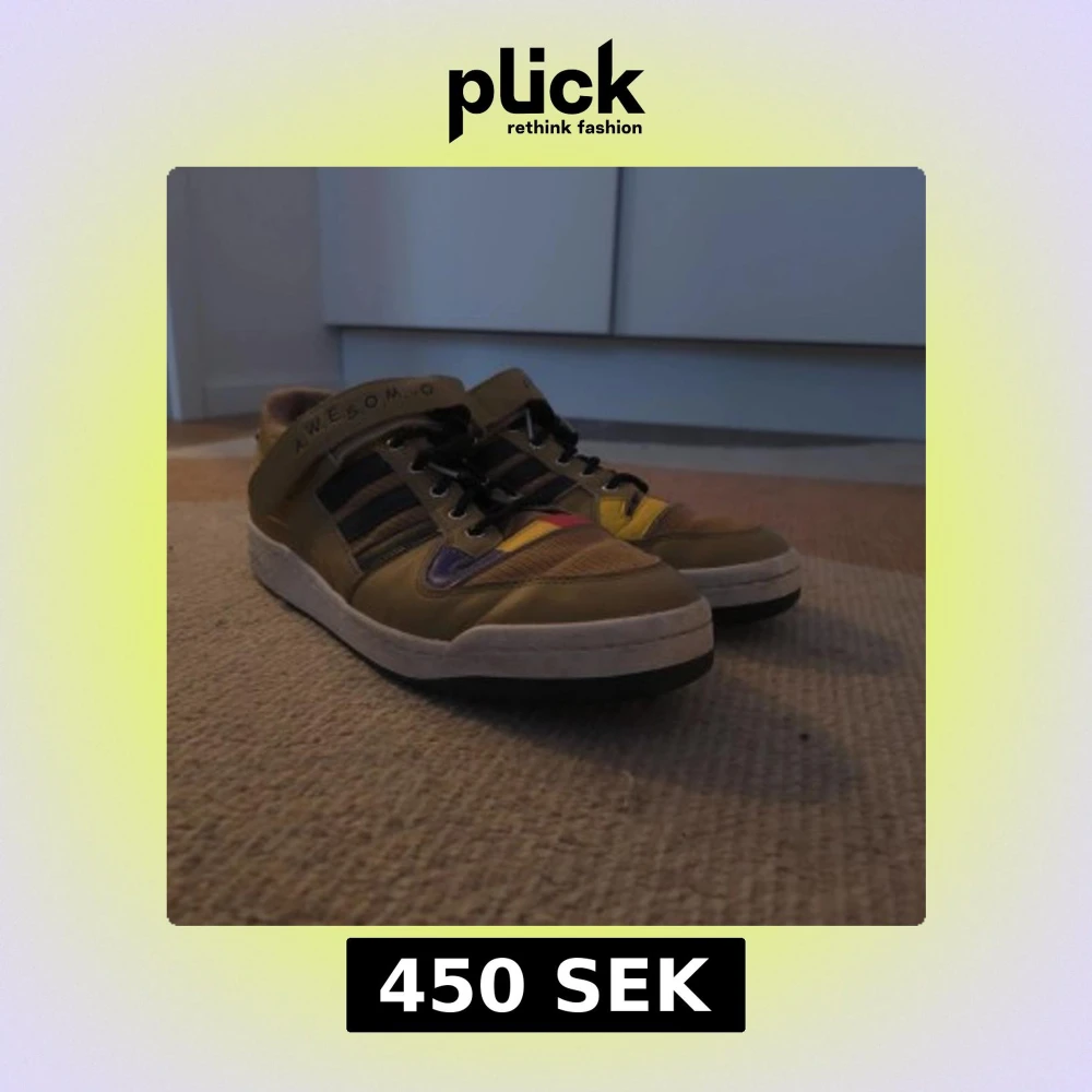Säljer ett par unika sneakers från Adidas med en cool färgkombination av beige, svart, röd, gul och lila. Skorna har snörning och en bred rem med texten 'A.W.E.S.O.M.-O'. Perfekta för dig som vill sticka ut!