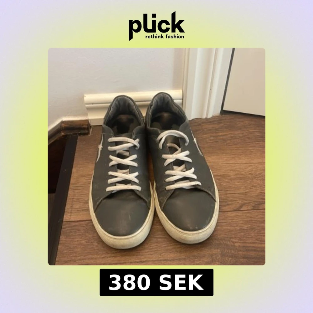 Säljer ett par grå sneakers med vitt fågelmotiv på sidan. Skorna har vita snören och vit platt sula. Perfekta för dig som gillar enkel stil med en liten detalj. Passar till det mesta och är riktigt bekväma.