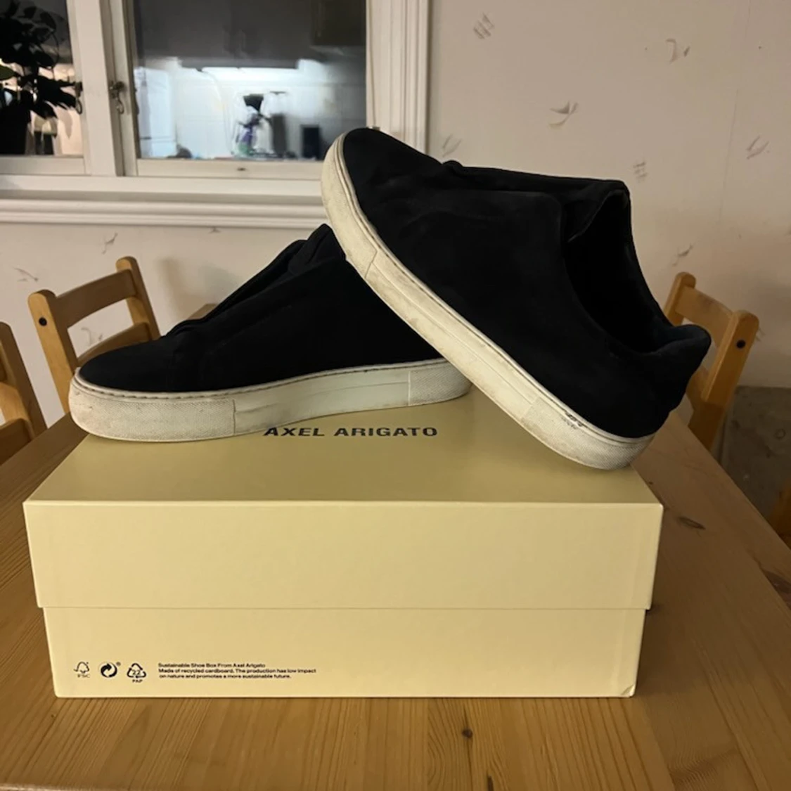 Axel Arigato 360 Laceless i använt skick. Storlek är 44 men passar med 43. Har någon liten svart fläck färg på sulan men inget man märker av. Som sagt är i använt skick så har sina defekter, i övrigt sköna och bekväma skor. Kvitto + box och tillbehör är helt felfrit! Pris kan diskuteras ❤️❤️