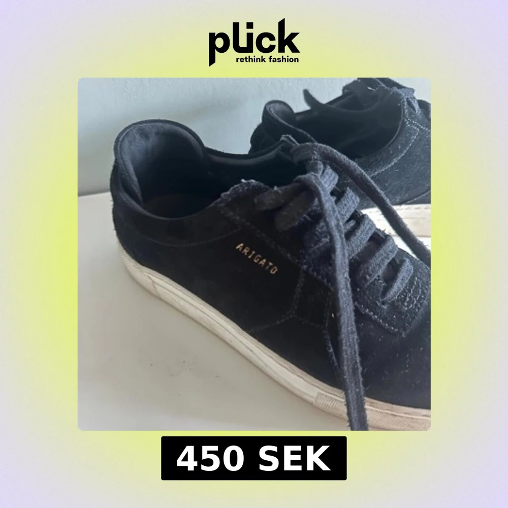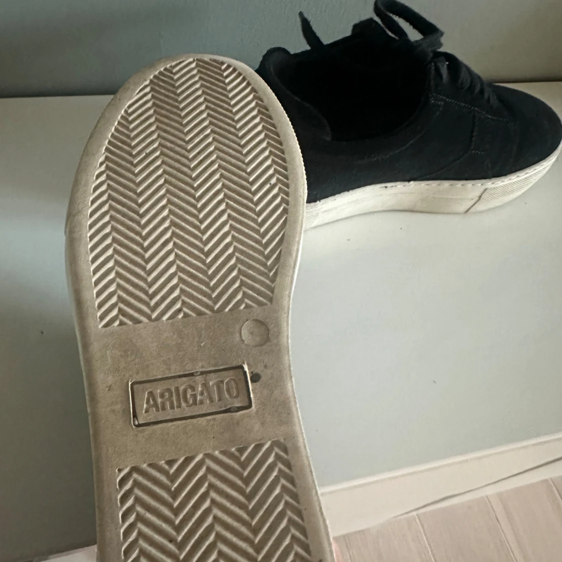 Snygga svarta sneakers från Axel Arigato i mocka med vit sula och klassisk snörning. Diskret guldtext på sidan och Arigato-logga under sulan. Perfekta för dig som gillar stilrena och trendiga skor med premiumkänsla.