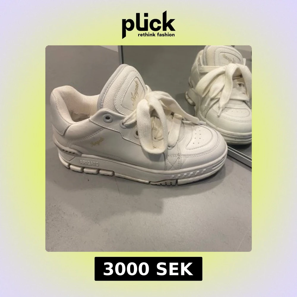 Säljer ett par fräscha vita sneakers från Axel Arigato med tjock sula och breda vita skosnören. Skorna har diskreta gulddetaljer med logga på sidan och plösen. Perfekta för en clean och stilren look. Sparsamt använda.