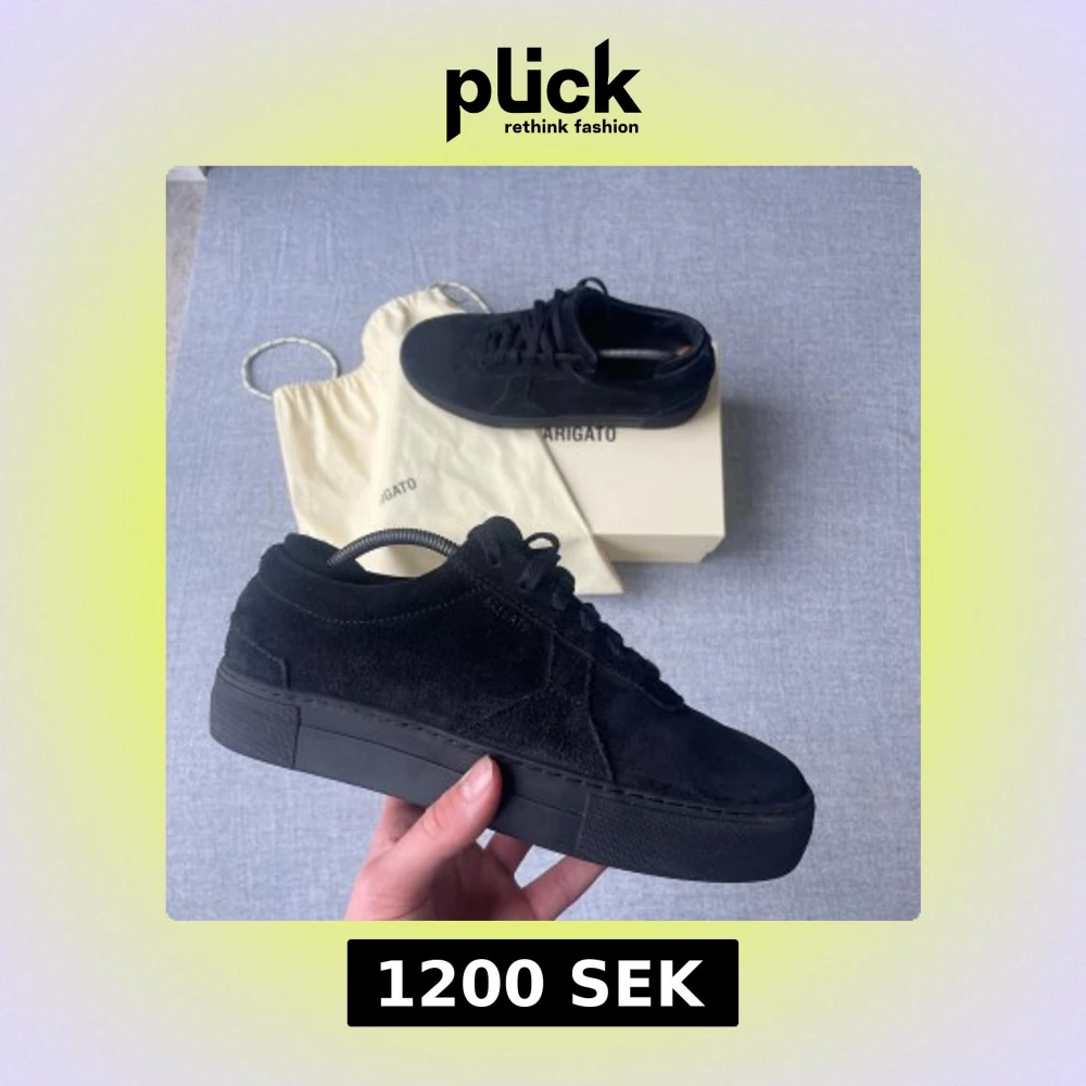 Snygga svarta sneakers från Axel Arigato med en stilren design. Skorna har en plattformssula och är tillverkade i mocka. Perfekta för en trendig look. Ny pris≈2500kr mitt pris 1200kr du får med det som finns på bilden