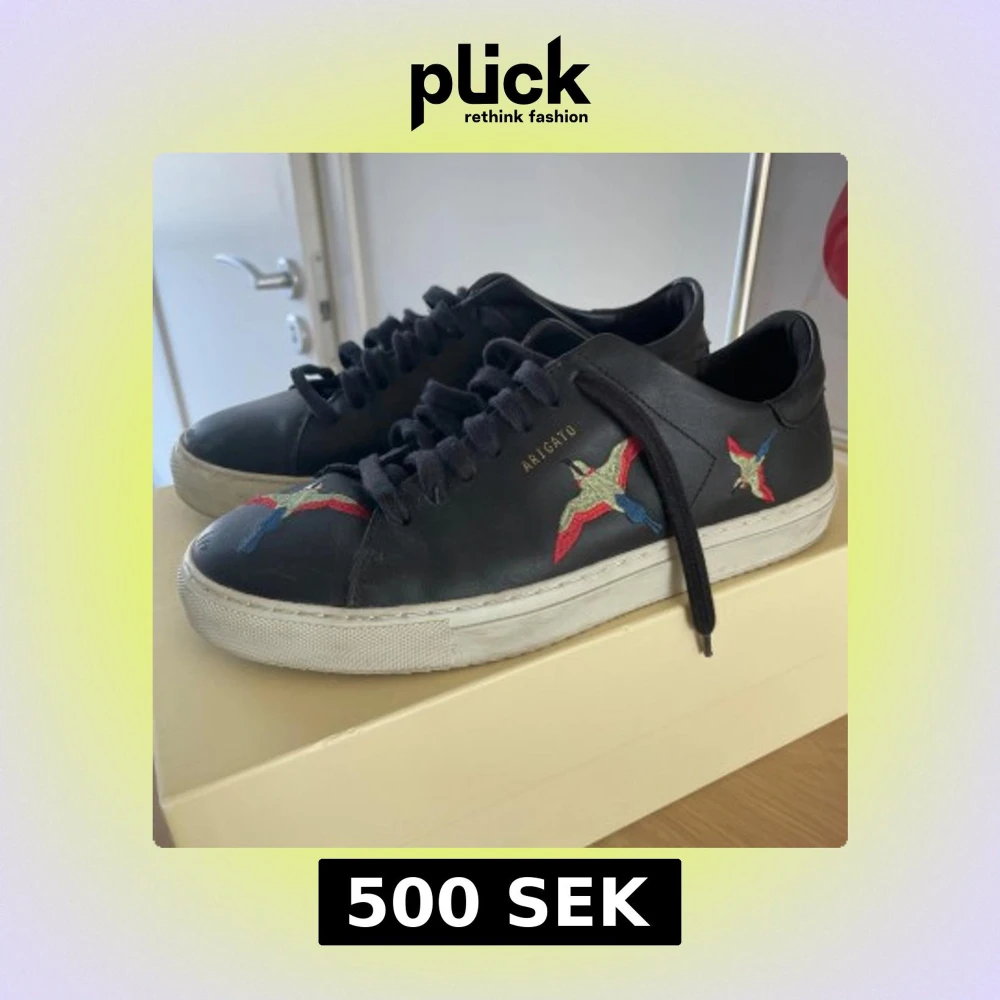 Snygga svarta sneakers från Axel Arigato med broderade fåglar i rött, blått och grönt på sidorna. Skorna har en vit sula och svarta snören. Perfekta för en stilren look.