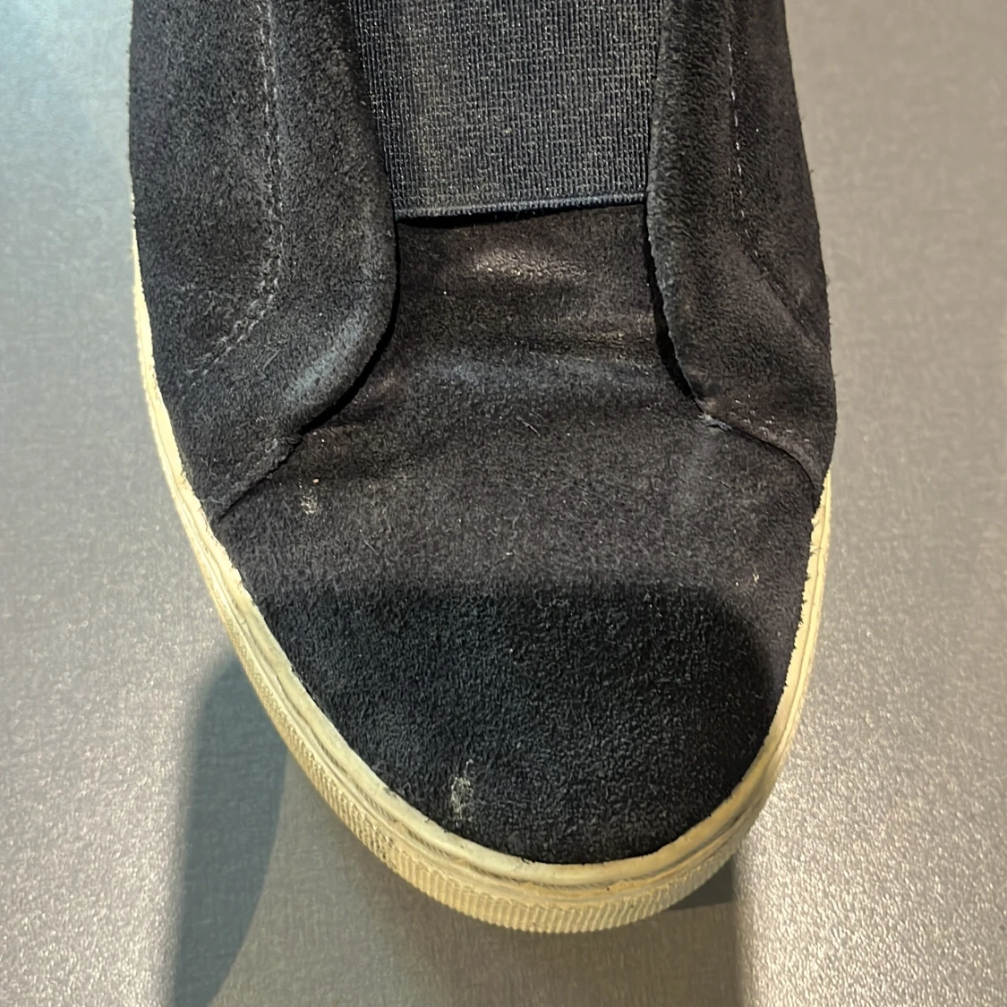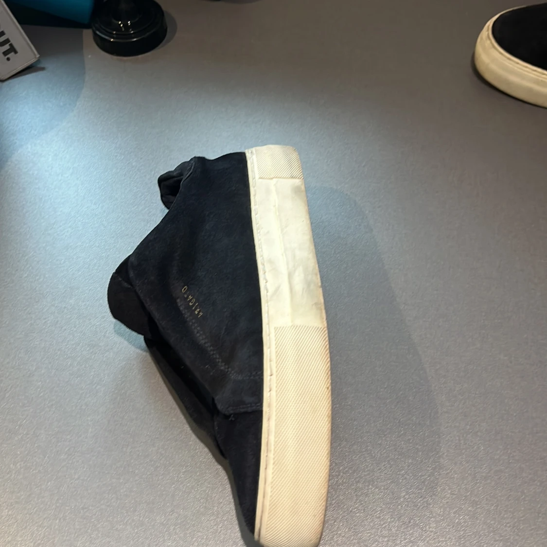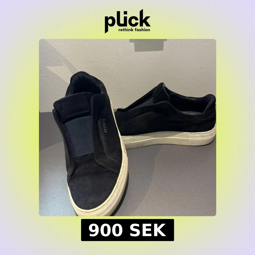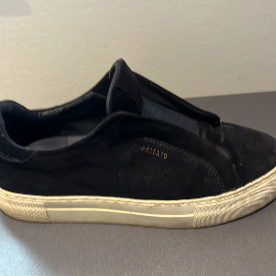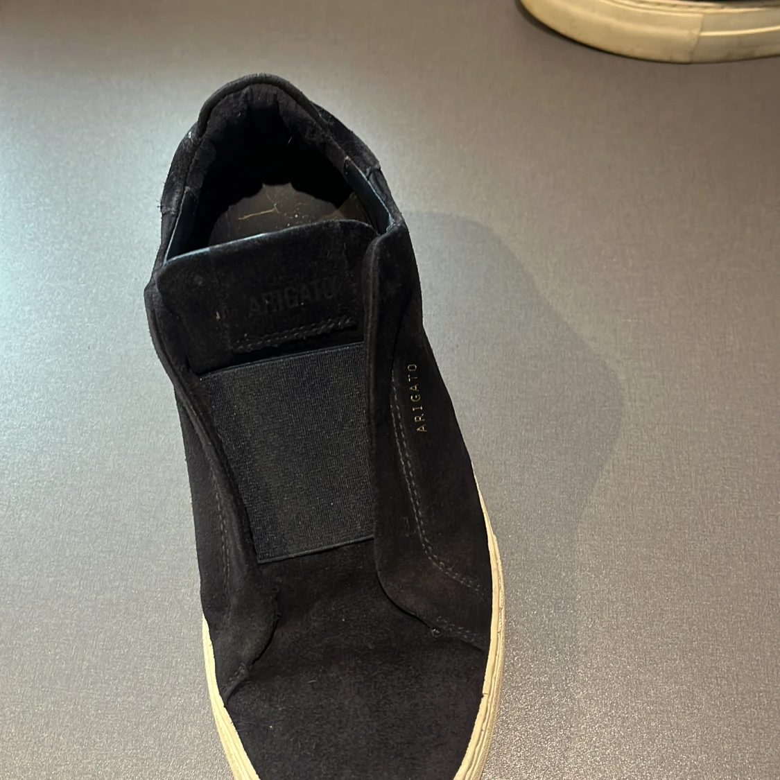 Svarta sneakers från Axel Arigato med stilren design och vit platt sula. Skorna är tillverkade i mocka och har elastisk panel över vristen istället för snörning. Diskret logotyp i guld på sidan. Perfekt för dig som gillar minimalistisk och modern stil.