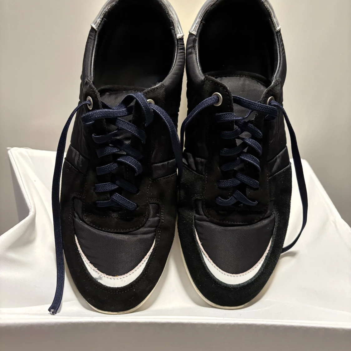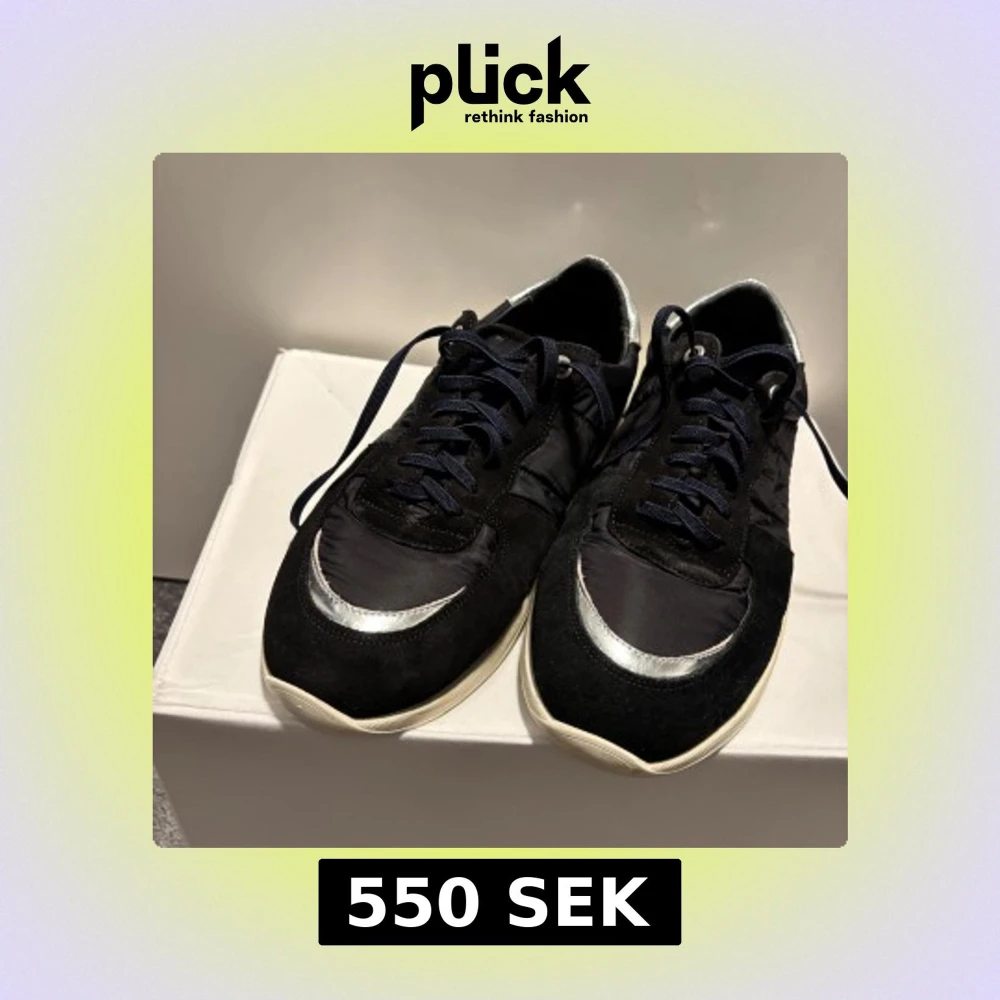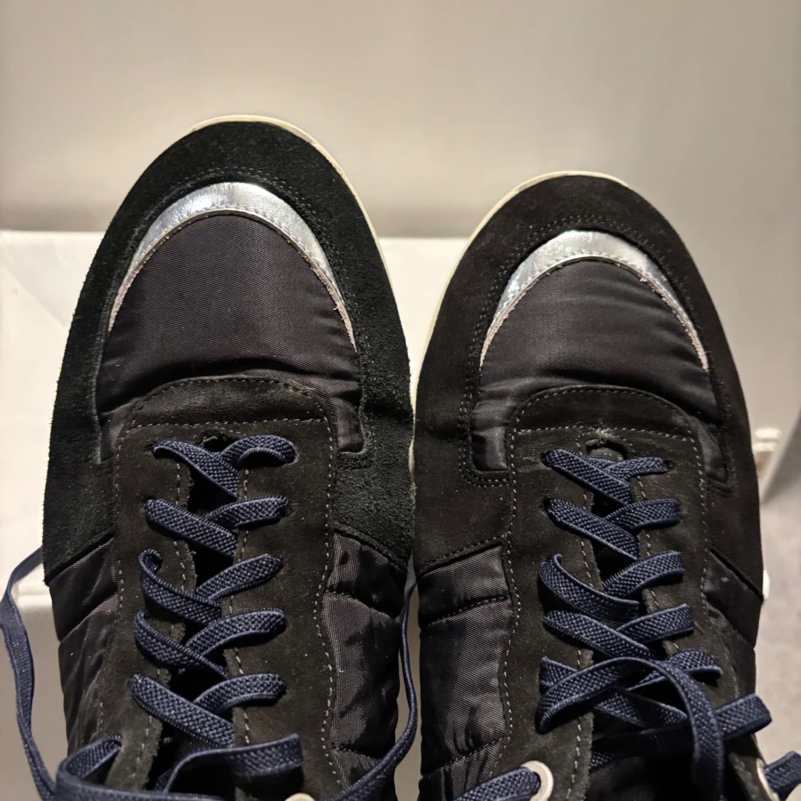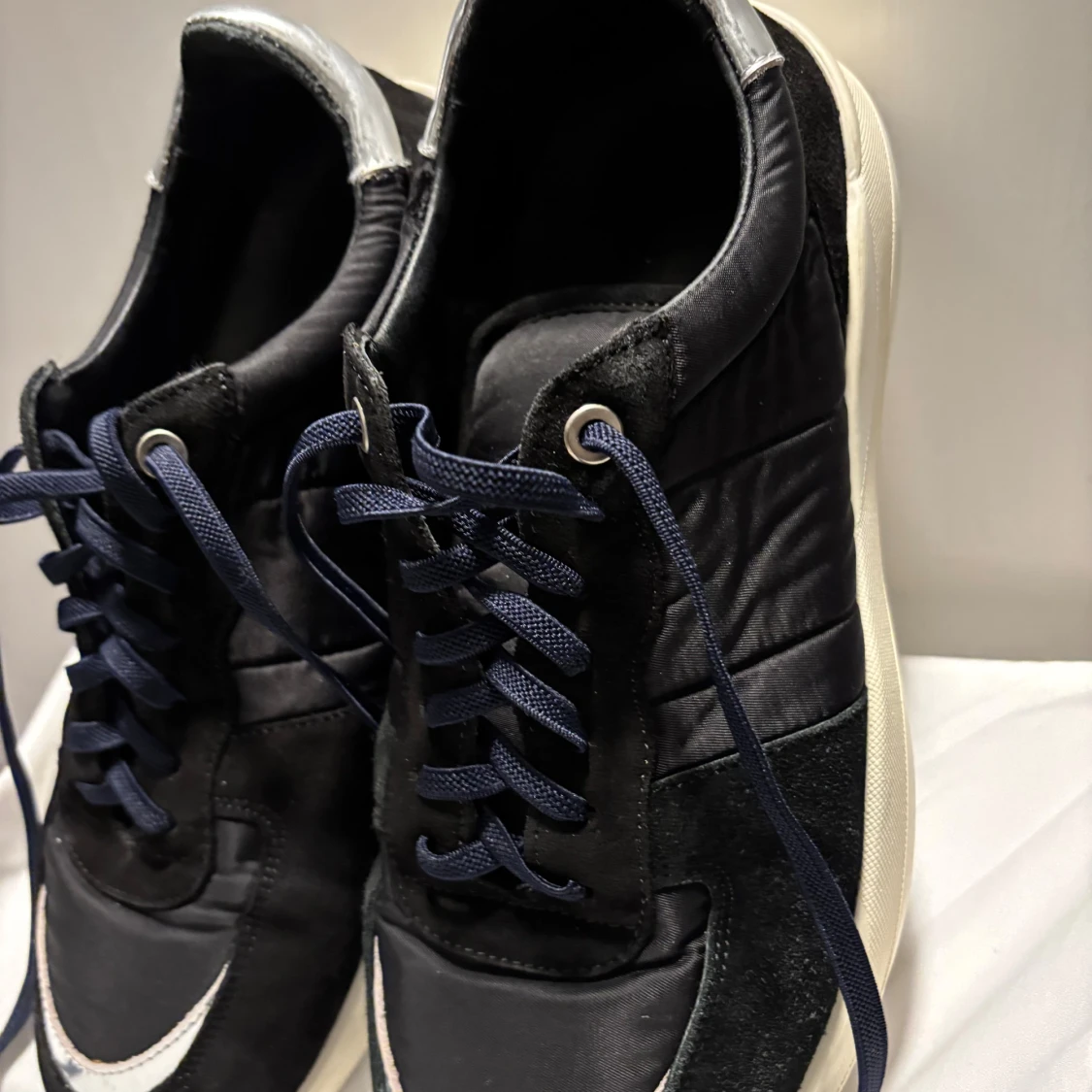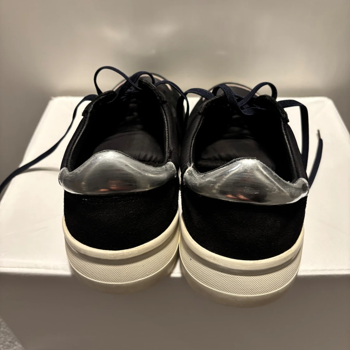 Svarta sneakers med coola detaljer i mocka och textil, samt silvriga inslag vid tån. Skorna har en vit, rejäl sula och klassisk snörning (snören medföljer). Perfekta för dig som gillar en sportig och stilren look.
