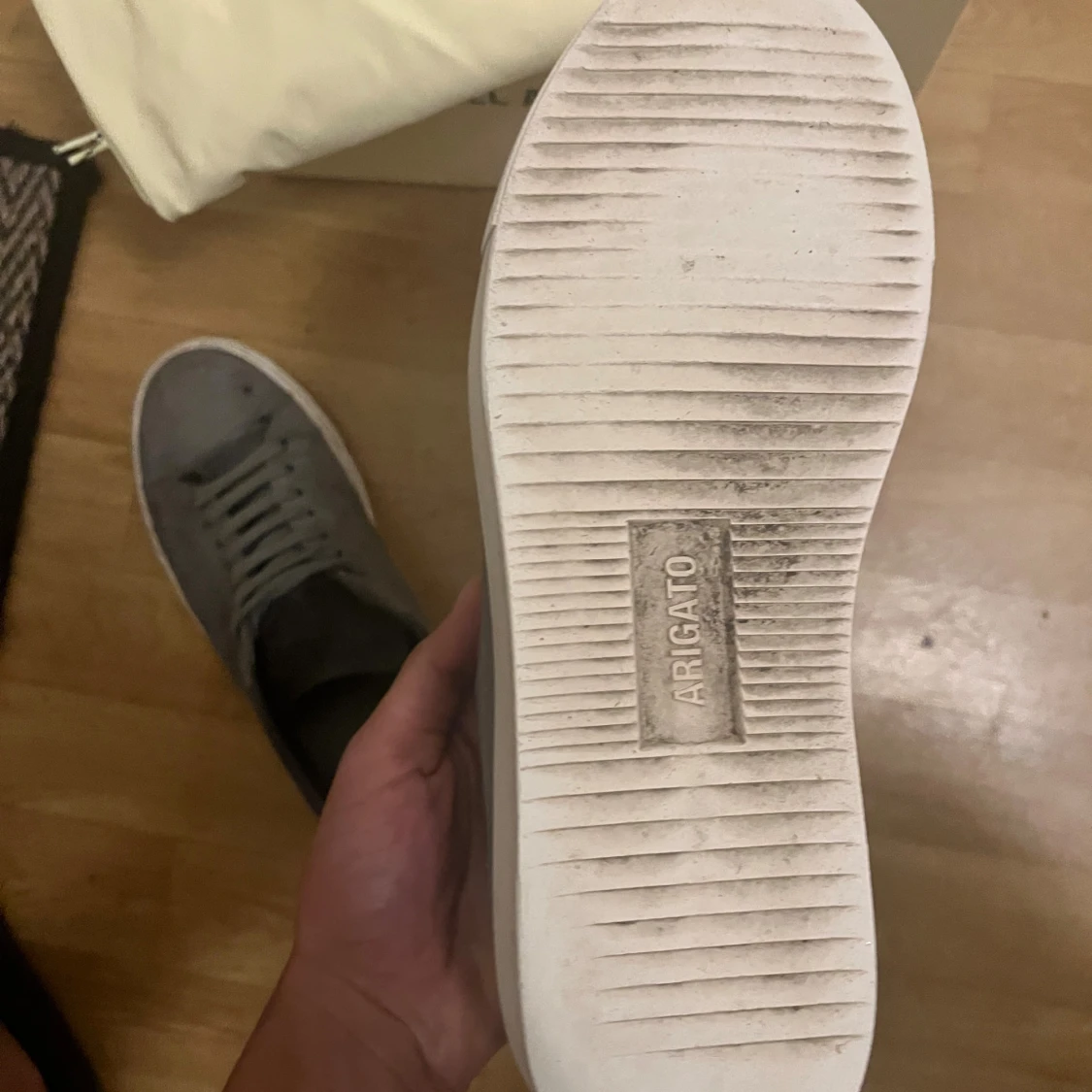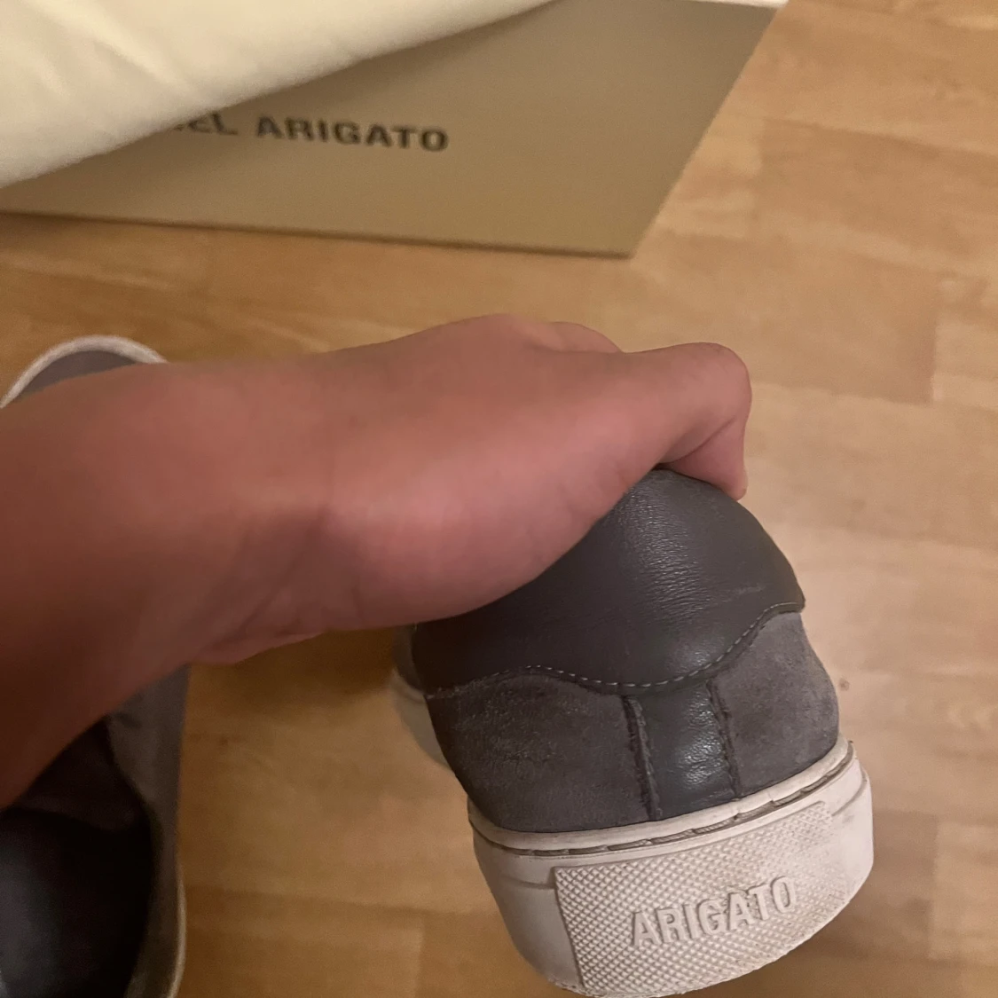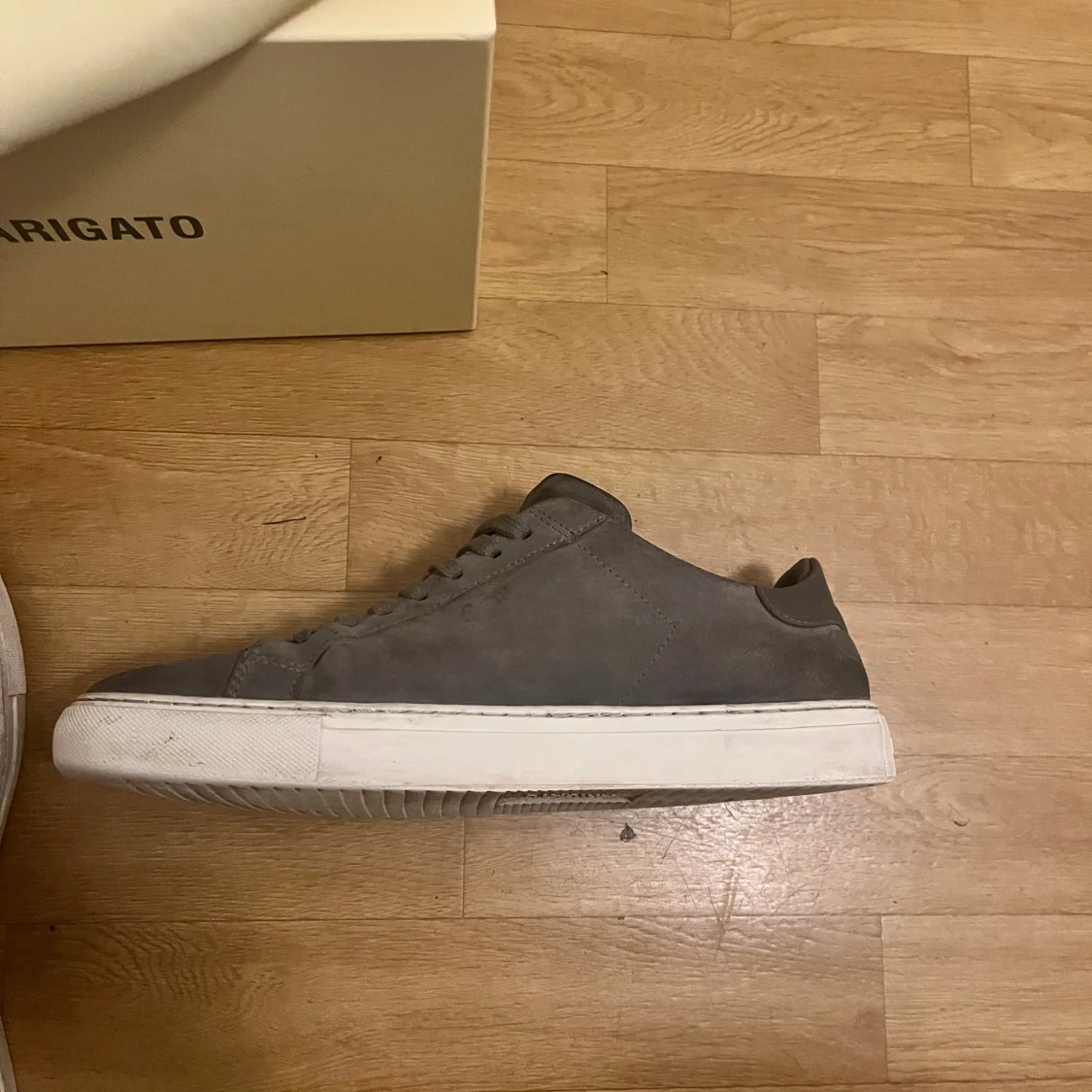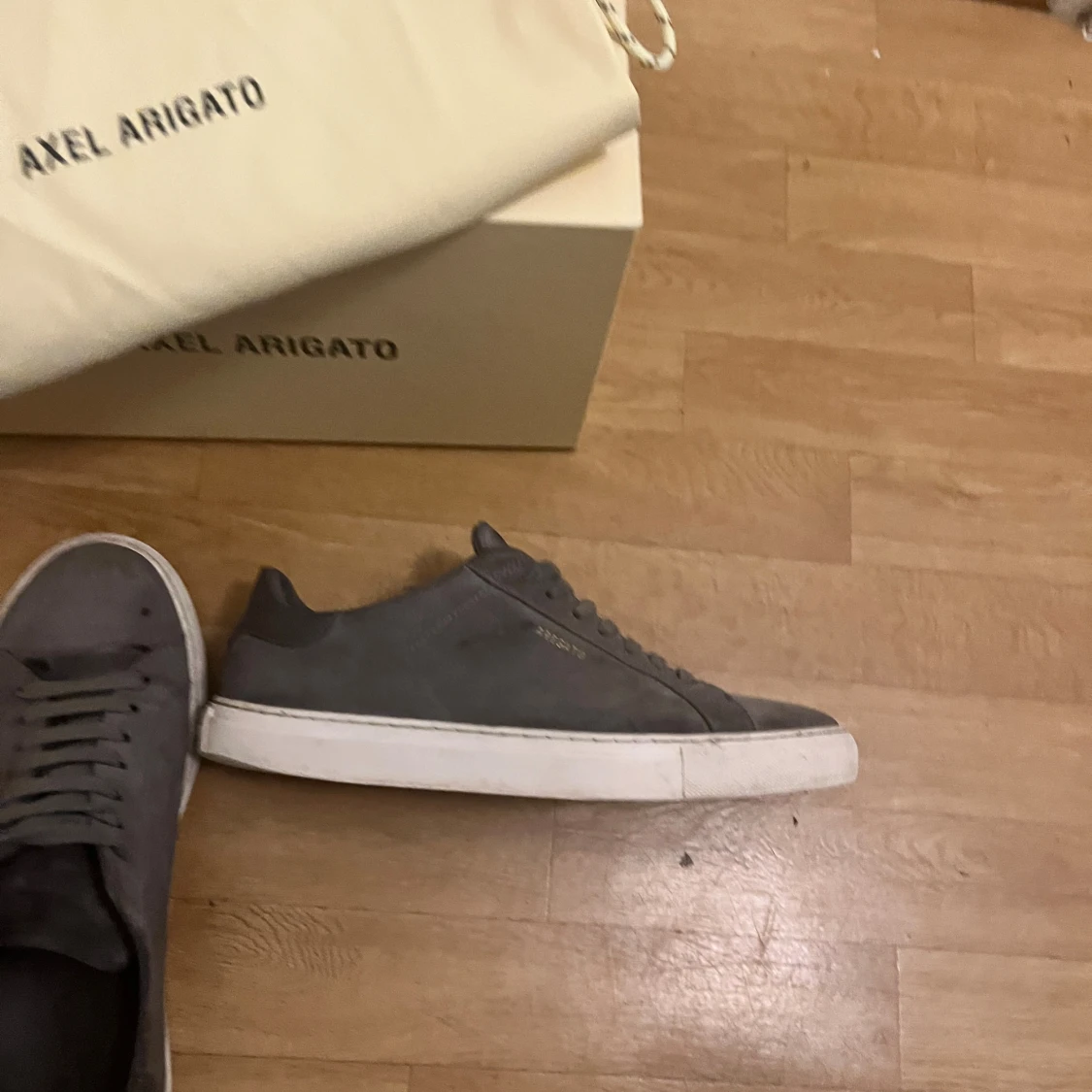 Snygga grå sneakers från Axel Arigato med låg profil och platt vit sula. Skorna har rund tå, snörning och är tillverkade i mocka med detaljer i skinn på hälen. Perfekt för dig som gillar stilrena sneakers. Skorna tillkommer med box och dustbag, samt påsen om man vill göra meetup. Skorna har tecken på användning, mockan har fått sämre kvalité, dessutom har den ena skon fått en skvätt färg vilket sänker värdet . Nypris: 2700kr. Pris kan diskuteras!