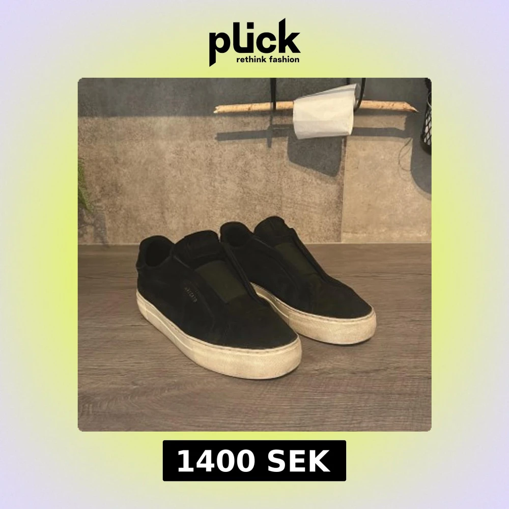Säljer ett par svarta sneakers från Arigato i mjuk mocka med vit platt sula. Skorna har minimalistisk design utan snörning och diskret Arigato-logga på sidan. Perfekta för dig som gillar stilrena och cleana skor med premiumkänsla.