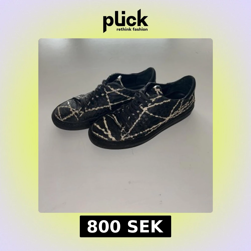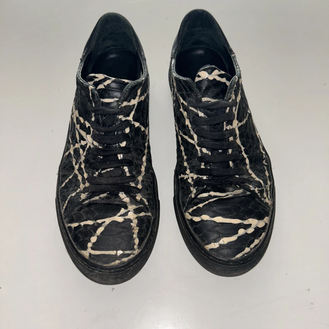 Unika svarta sneakers med vit, randig reptilmönstrad yta och snörning. Skorna har en platt sula och rund tå, tillverkade i skinn med en cool textur som sticker ut. Perfekta för dig som vill ha något annorlunda och edgy i din skogarderob.