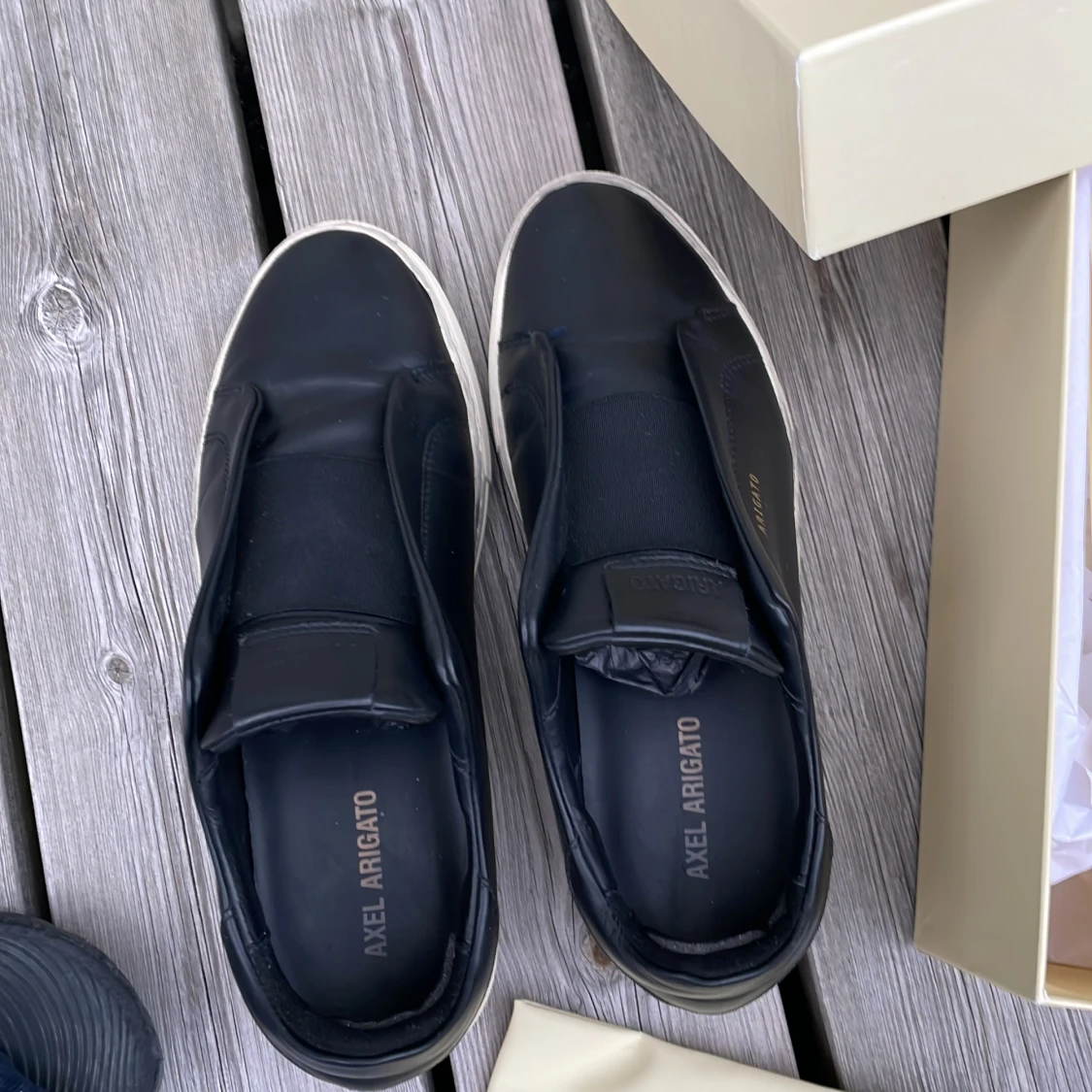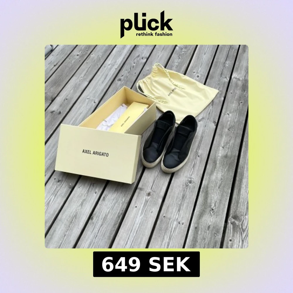 Stilrena svarta sneakers från Axel Arigato i skinn med vit platt sula. Låg modell utan snörning, med elastiska paneler för enkel påtagning. Diskret guldfärgad logga på sidan och klassisk rund tå. Perfekta för en clean och modern look. Har dock blivit lite lagade där bak annars är det perfekta.
