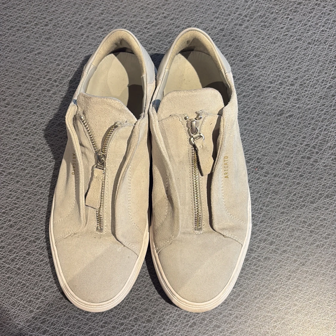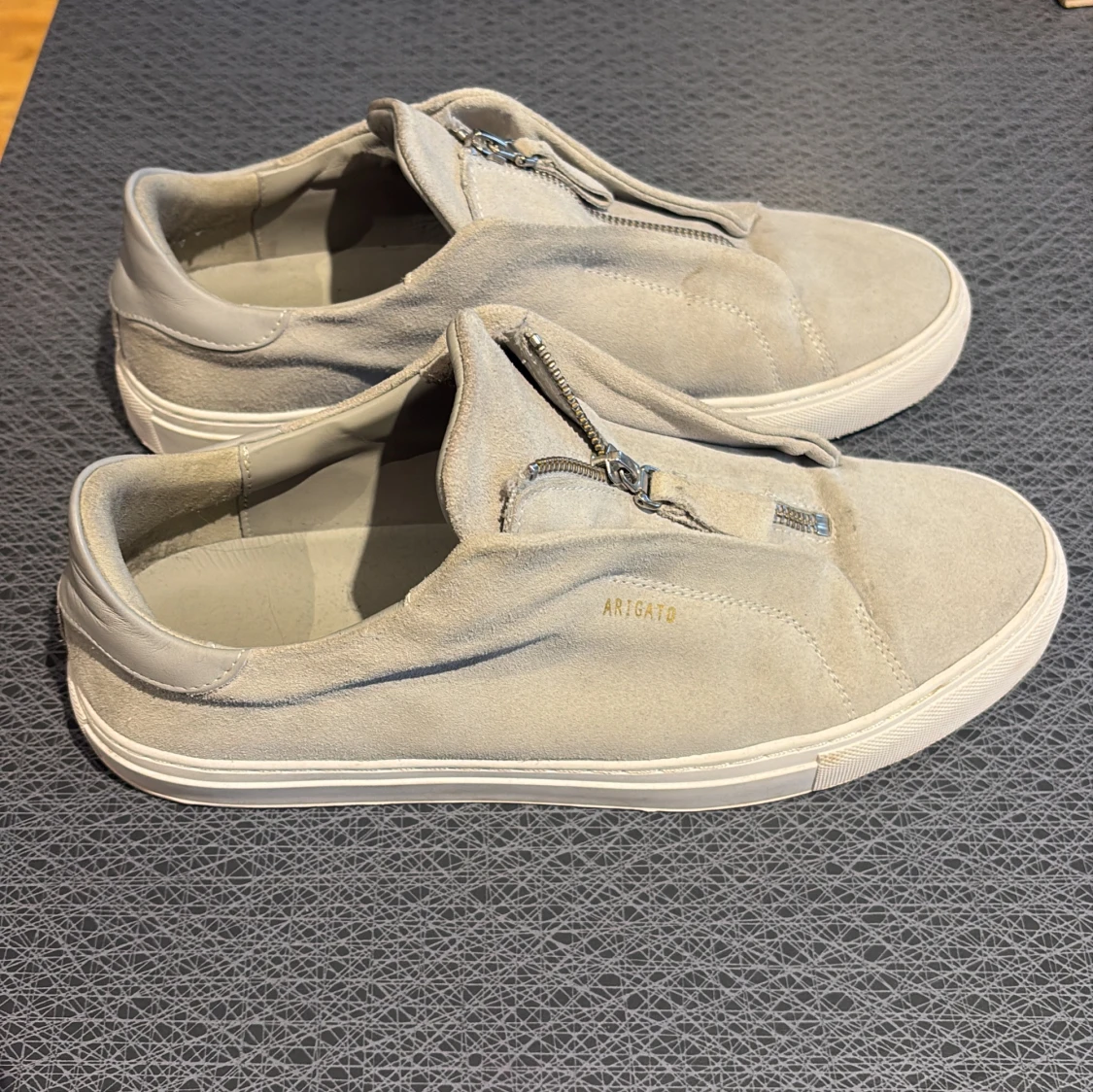 Snygga gråa sneakers från Axel Arigato i mocka med dragkedja framtill. Skorna har en stilren design med en platt sula och är perfekta för en avslappnad look. Märkesnamnet är diskret präglat på sidan. Box + dustbag tillkommer allt og!