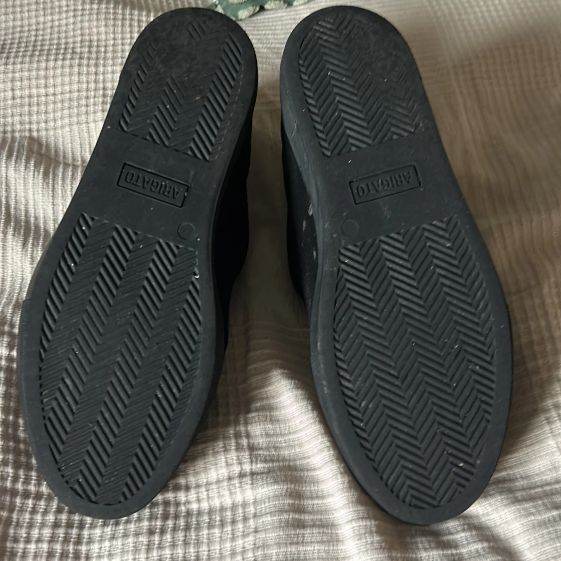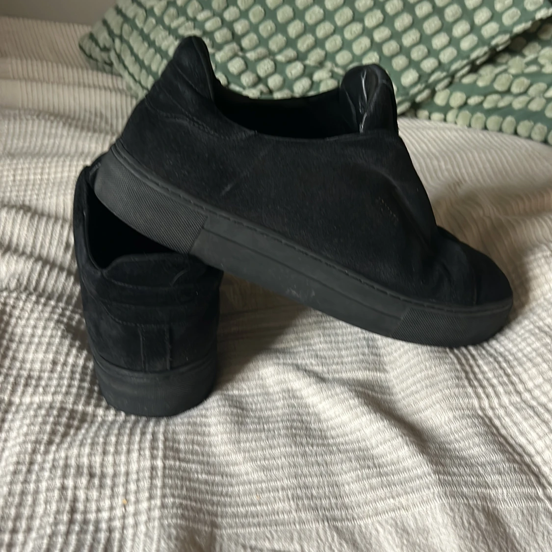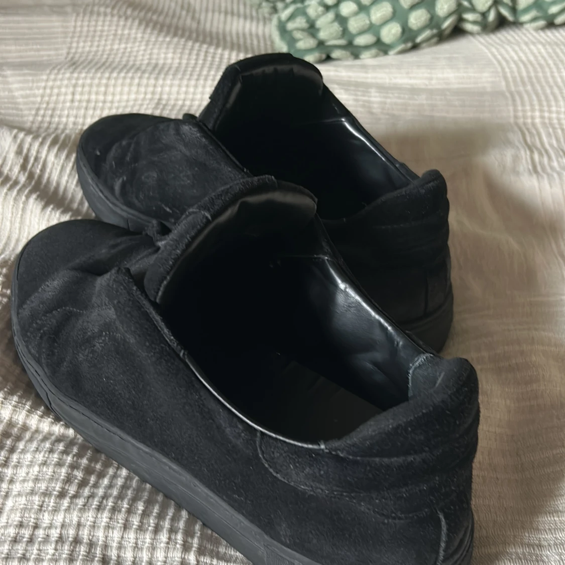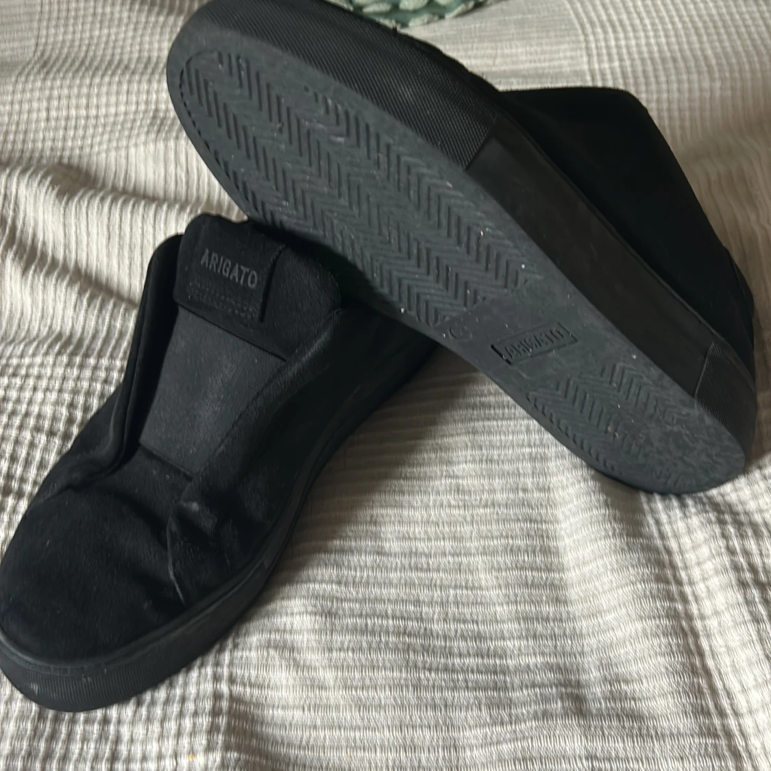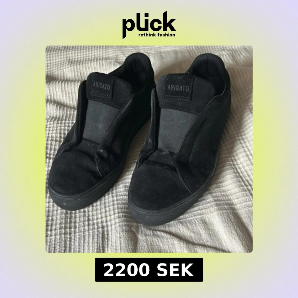 Säljer ett par helsvarta sneakers från Axel Arigato i mocka med minimalistisk design. Skorna har elastisk panel över vristen istället för klassisk snörning och en platt sula. Perfekta för dig som gillar stilrena och cleana skor.de ingår även lådan och ett par extra skosulor ca som är bra att ha om dem är lite för stora för att fylla utrymme