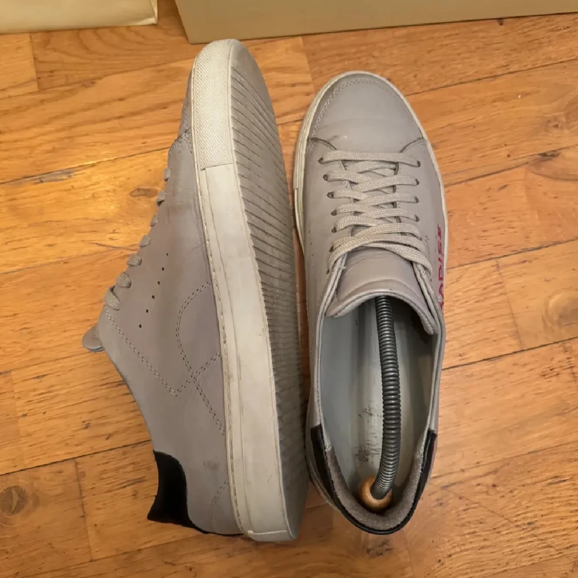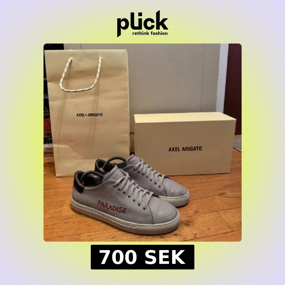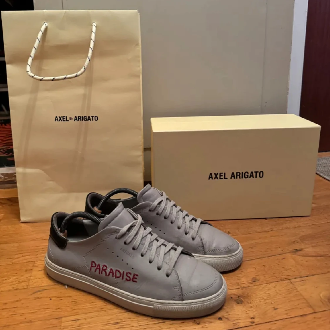 Snygga grå sneakers från Axel Arigato med texten 'PARADISE' broderad i rött på sidan. Skorna har svart detalj på hälen, rund tå och platt sula. Tillverkade i skinn med klassisk snörning. Perfekta för dig som gillar stilrena och trendiga sneakers.