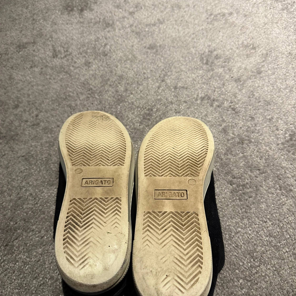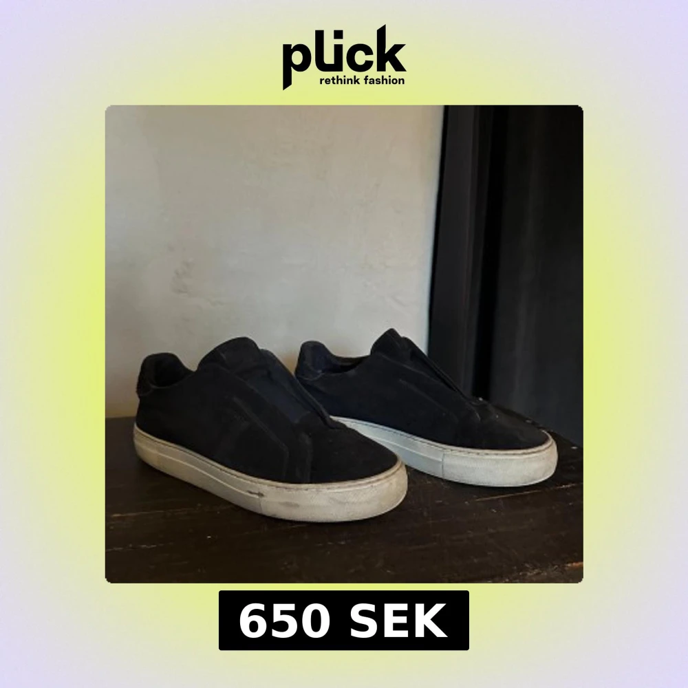 Blåa sneakers från Axel Arigato med stilren design och platt vit sula. Skorna har små slitningar inne. Annars är dom bara smutsiga. Skorna är tillverkade i mocka och har en låg profil utan synlig snörning för en clean look. Perfekta för dig som gillar minimalistisk stil och vill ha något som funkar till jeans eller dressade byxor. Pris kan diskuteras men inte för lågt