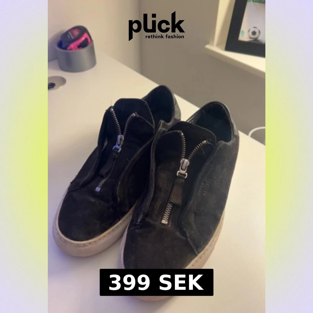 Svarta sneakers från ARIGATO i mocka med vit platt sula och dragkedja framtill istället för klassisk snörning. Snygg minimalistisk design med rund tå och diskret logga på sidan. Perfekta för dig som gillar stilrena och unika detaljer.