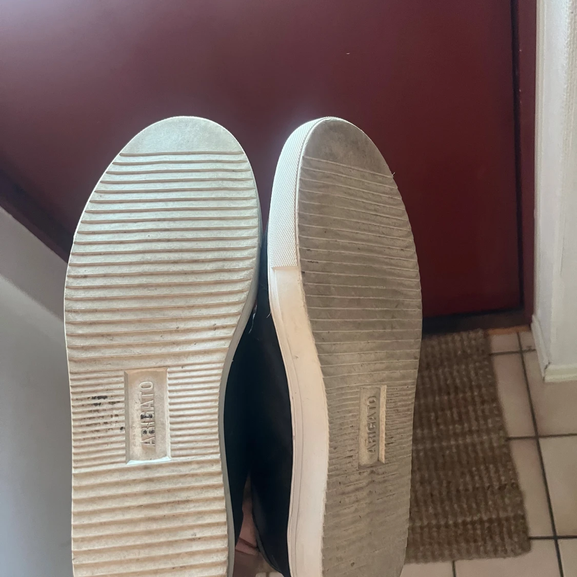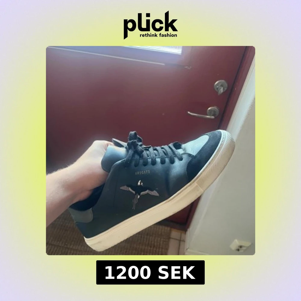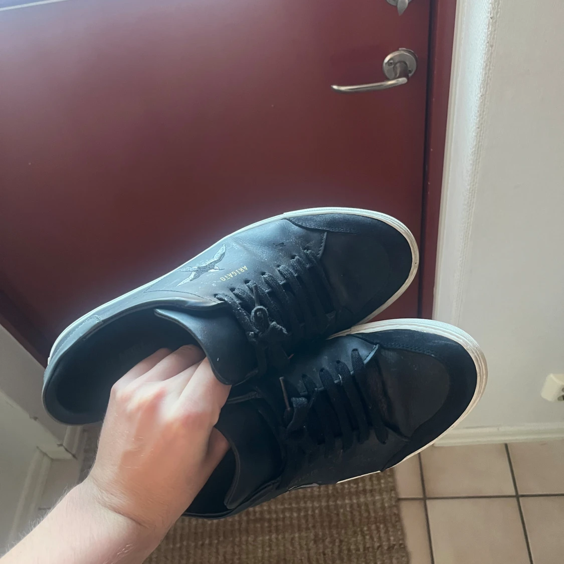 Svarta sneakers från Axel Arigato med broderad fågel på sidan och vit platt sula. Skorna har snörning och är tillverkade i skinn med detaljer i mocka vid tån. Klassisk låg modell med stilren design och diskret logga i guld på sidan.