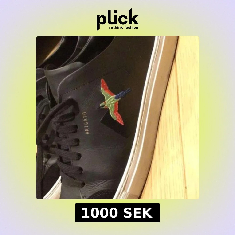 Snygga svarta sneakers från Axel Arigato med en broderad fågel i färgglada nyanser på sidan. Skorna har en vit sula och svarta snören, vilket ger en stilren look. Perfekta för en casual stil.