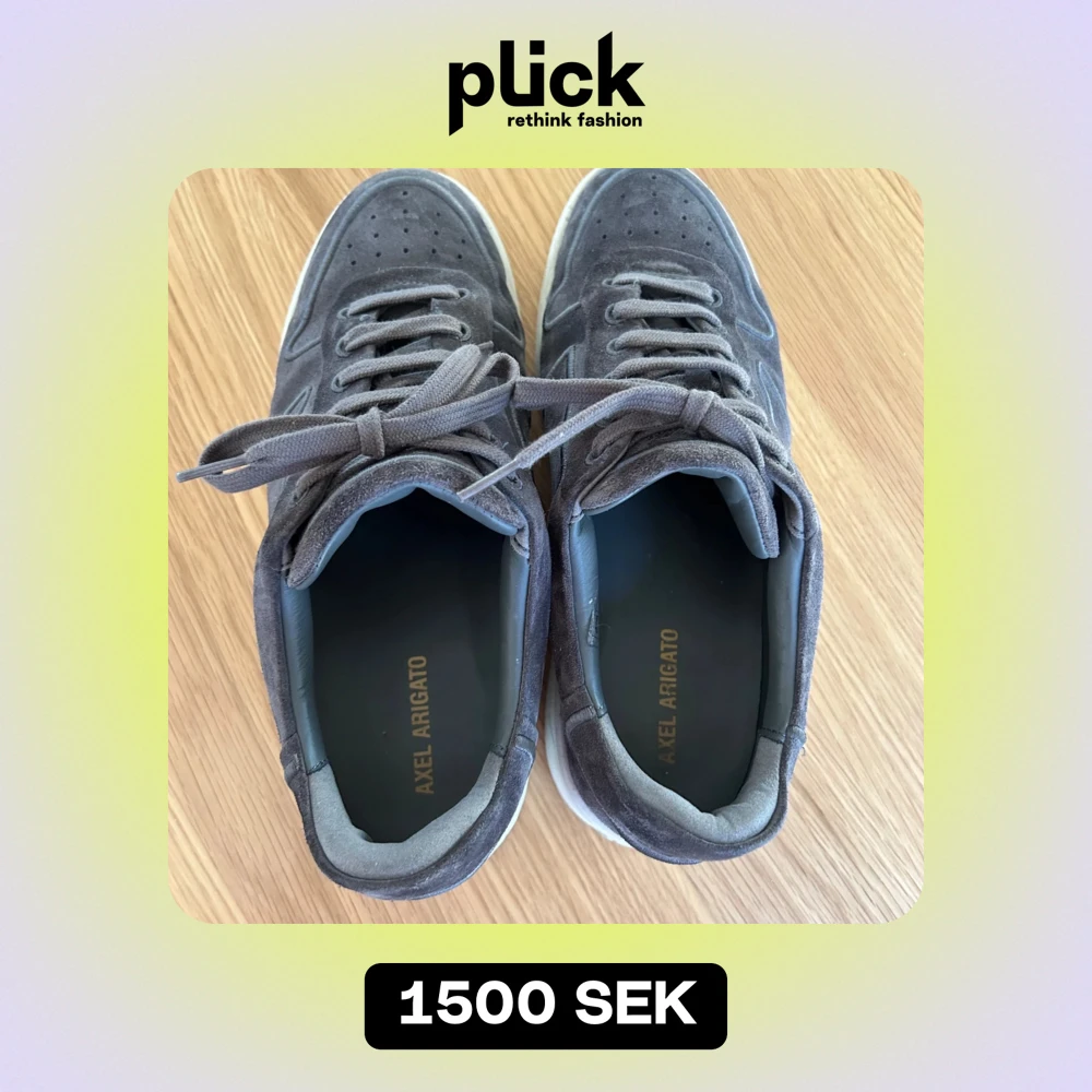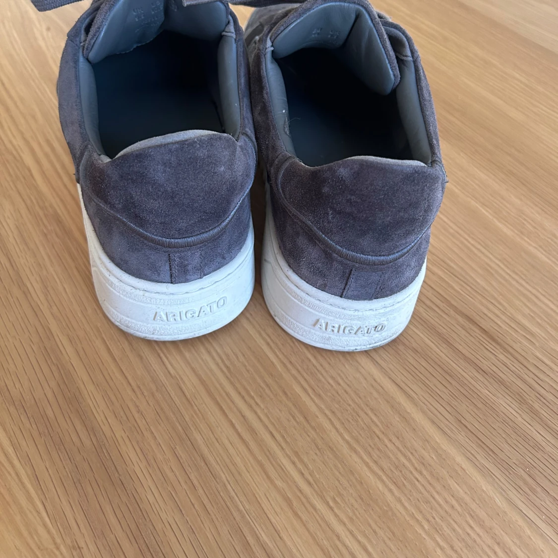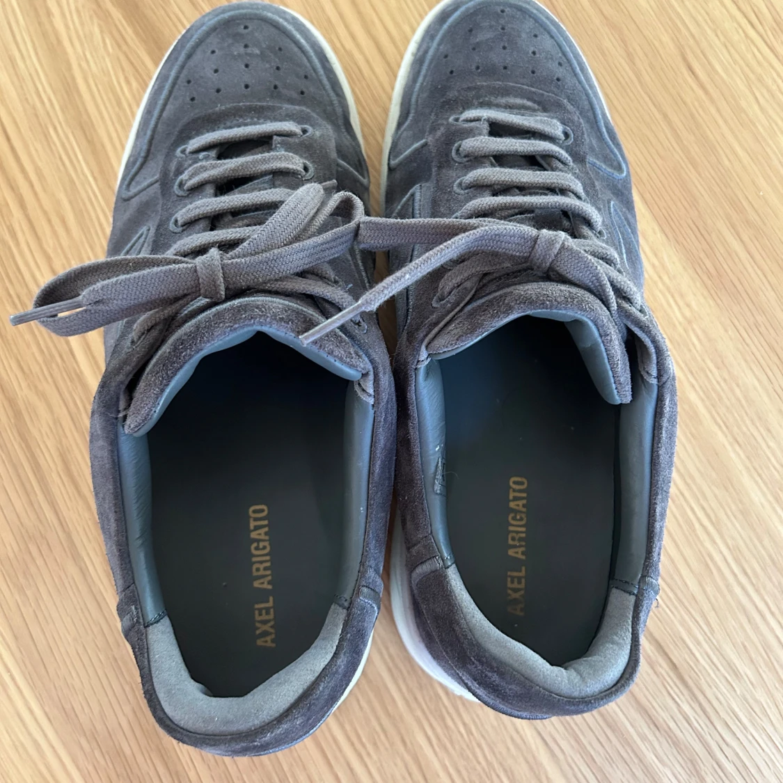 Säljer ett par snygga grå sneakers från Axel Arigato i mocka. De har en stilren design med snörning och en vit sula som ger en skön kontrast. Perfekta för både vardag och fest! 🕺