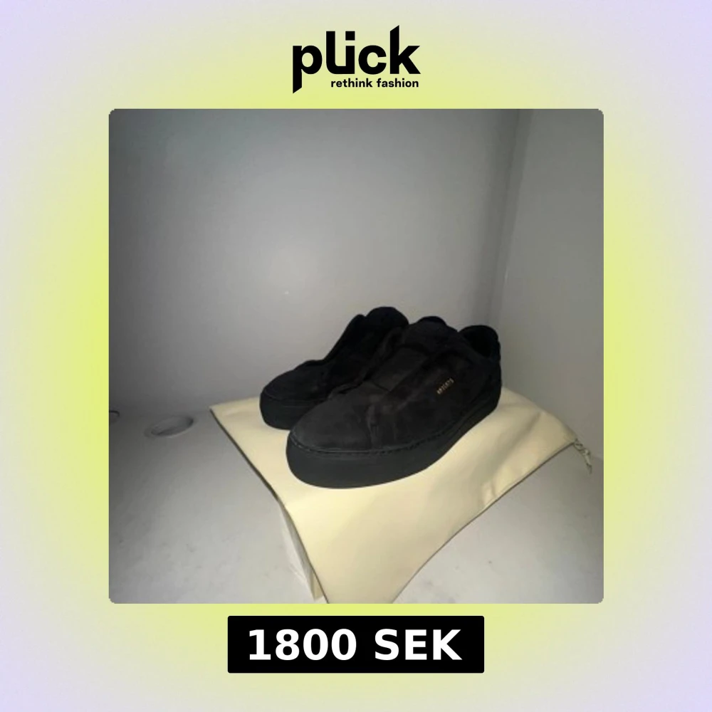 Snygga svarta sneakers från Axel Arigato i mjuk mocka med diskret guldfärgad logga på sidan. Skorna har en minimalistisk design med platt sula och rund tå, perfekta för en clean och stilren look. Kommer med originalpåse och låda.