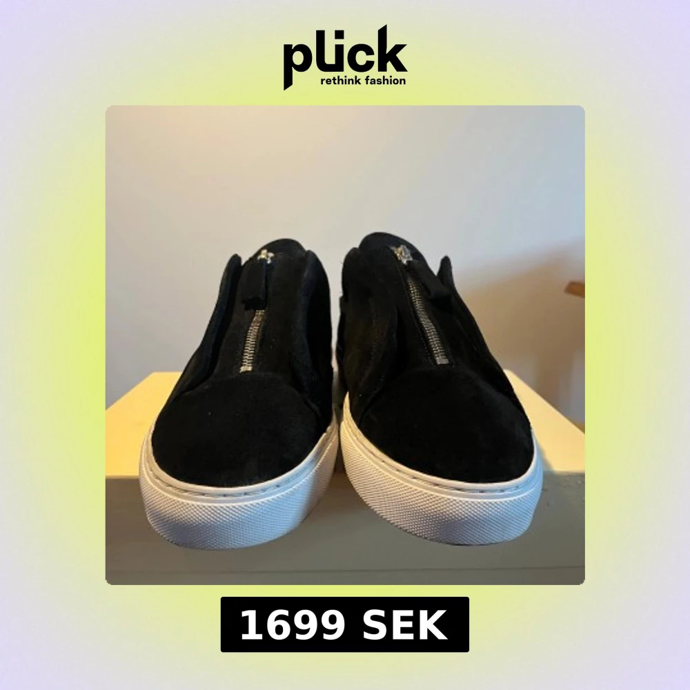 Säljer ett par svarta sneakers från Axel Arigato i mocka med vit platt sula och dragkedja framtill istället för klassisk snörning. Passar flera storlekar