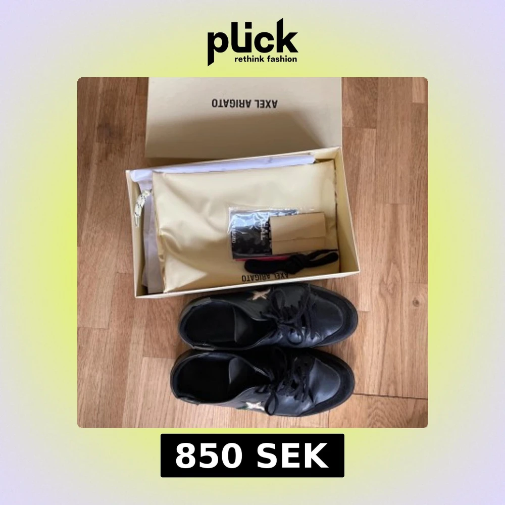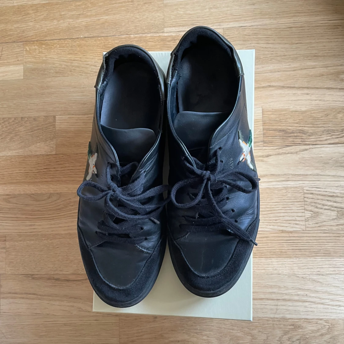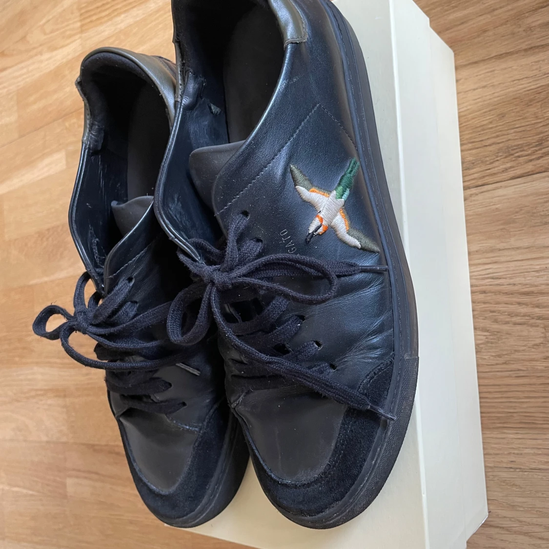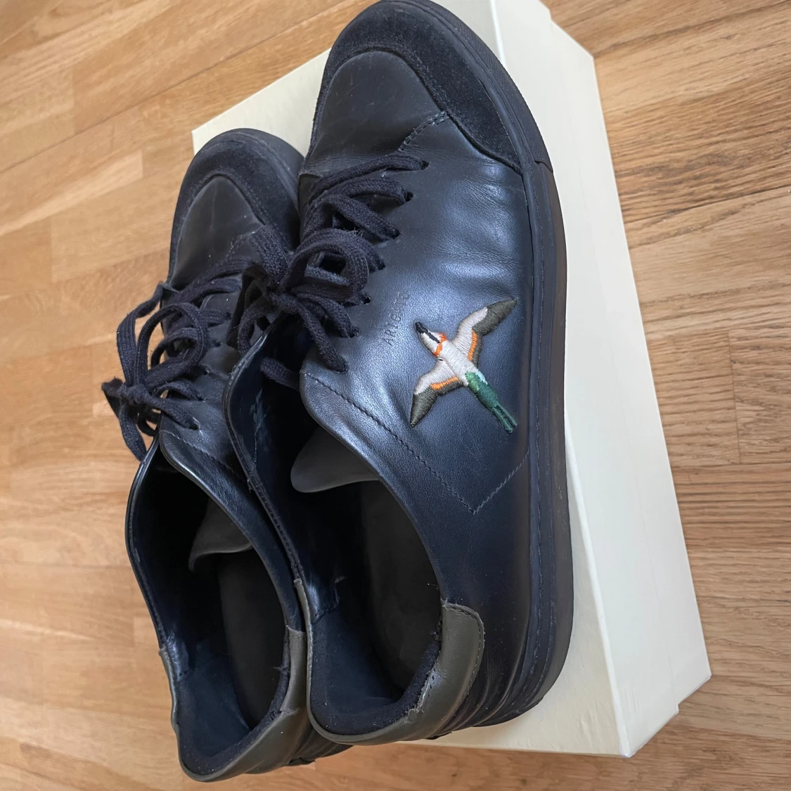 Säljer ett par svarta sneakers från Axel Arigato med snygg broderad fågel på sidan. Skorna har snörning, rund tå och platt sula. Tillverkade i skinn med detaljer i mocka framtill. Kommer med originalkartong och extra skosnören.