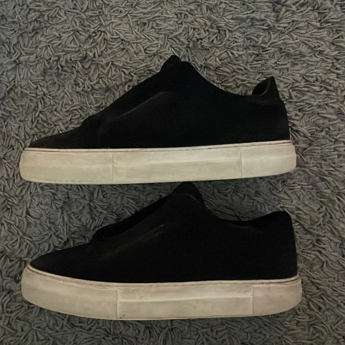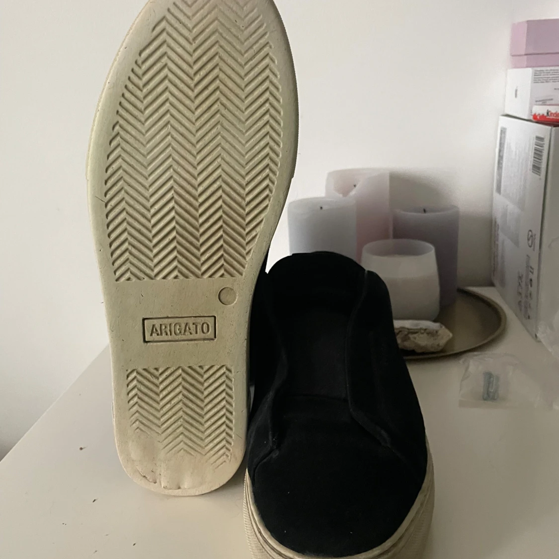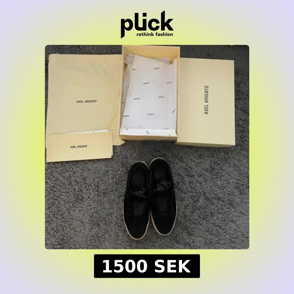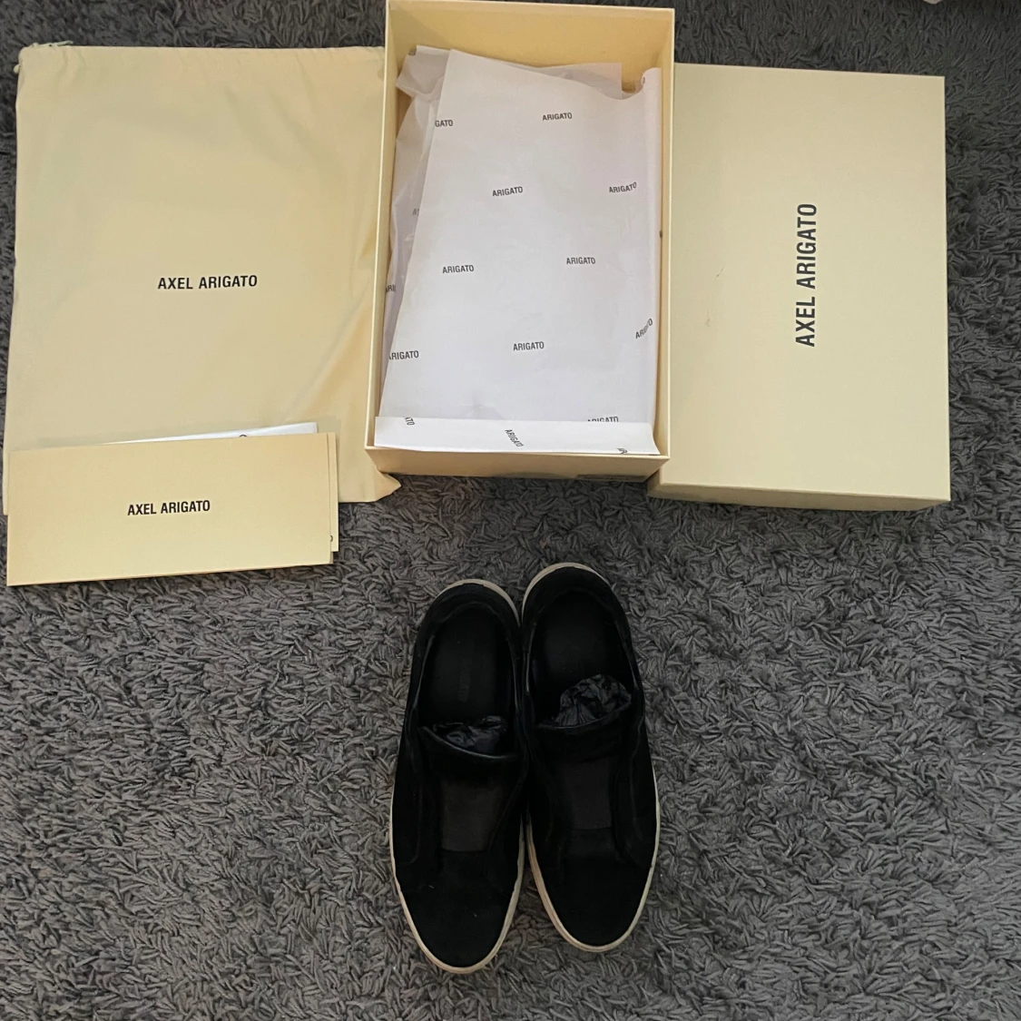 Svarta sneakers från Axel Arigato med stilren design och vit platt sula. Skorna är i mocka och utan snören. Perfekta för dig som gillar en clean och modern stil. Allt på bilden medföljer. Ps är inte hugget i sten. Ny pris 2300