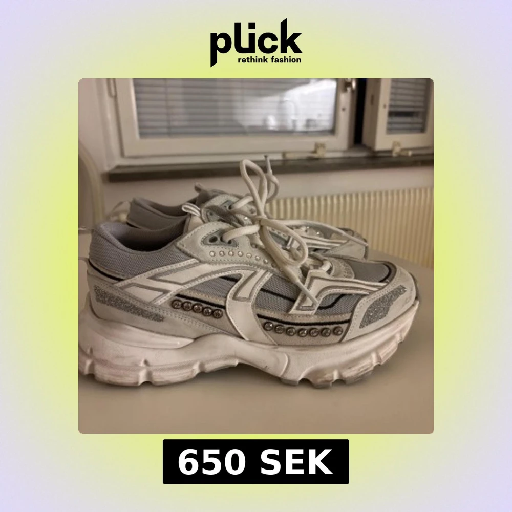Snygga chunky sneakers i vitt och grått med glittriga strassdetaljer och silvriga inslag. Skorna har snörning, tjock sula och coola paneler i mesh och syntet. Perfekta för dig som vill sticka ut med lite extra bling i vardagen. Köpta för 3000kr.