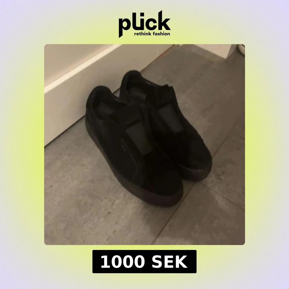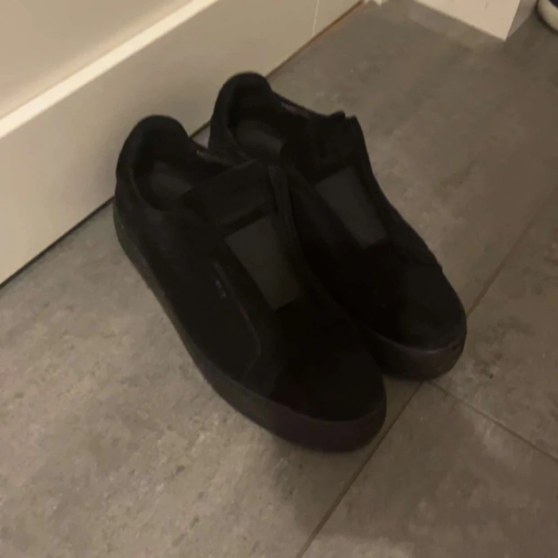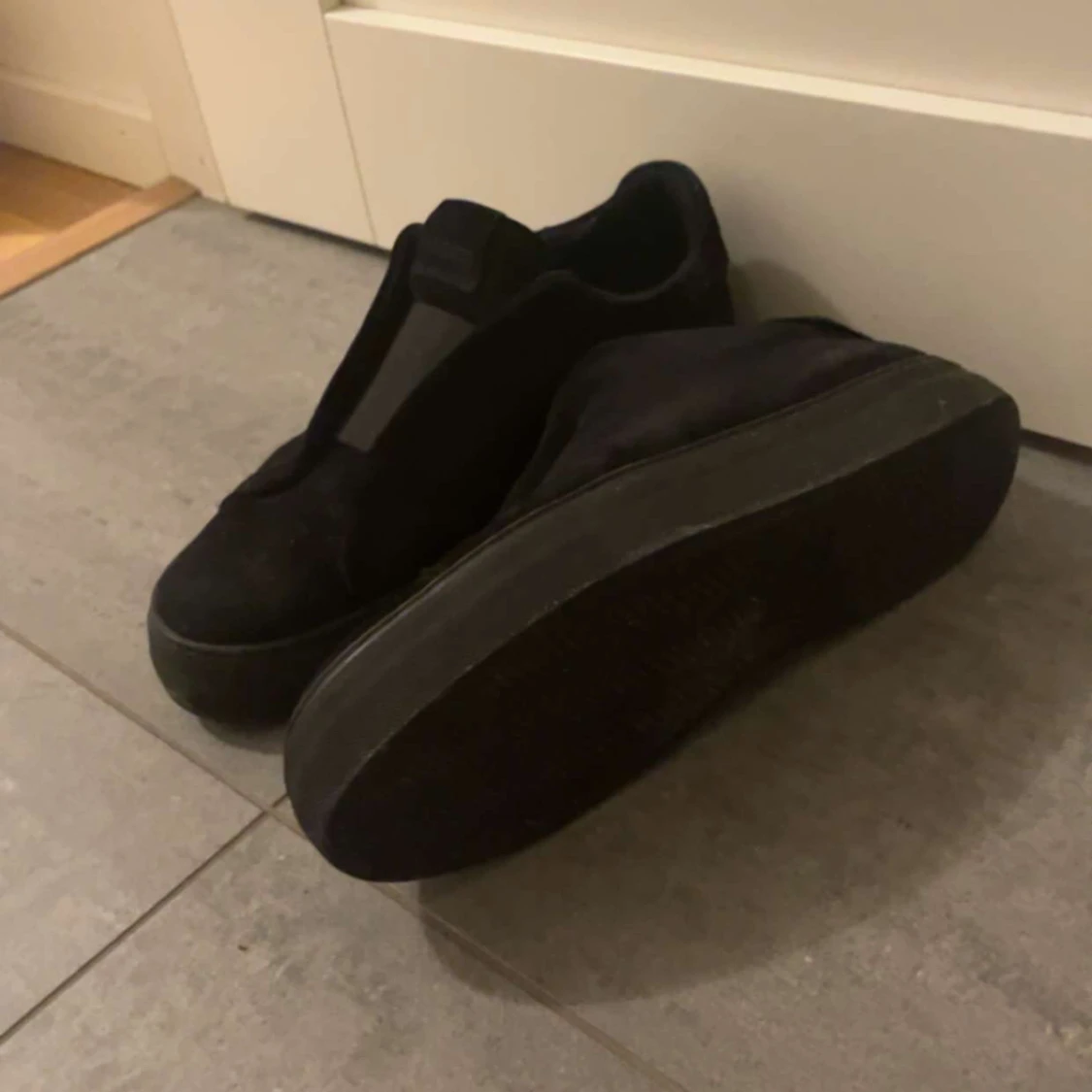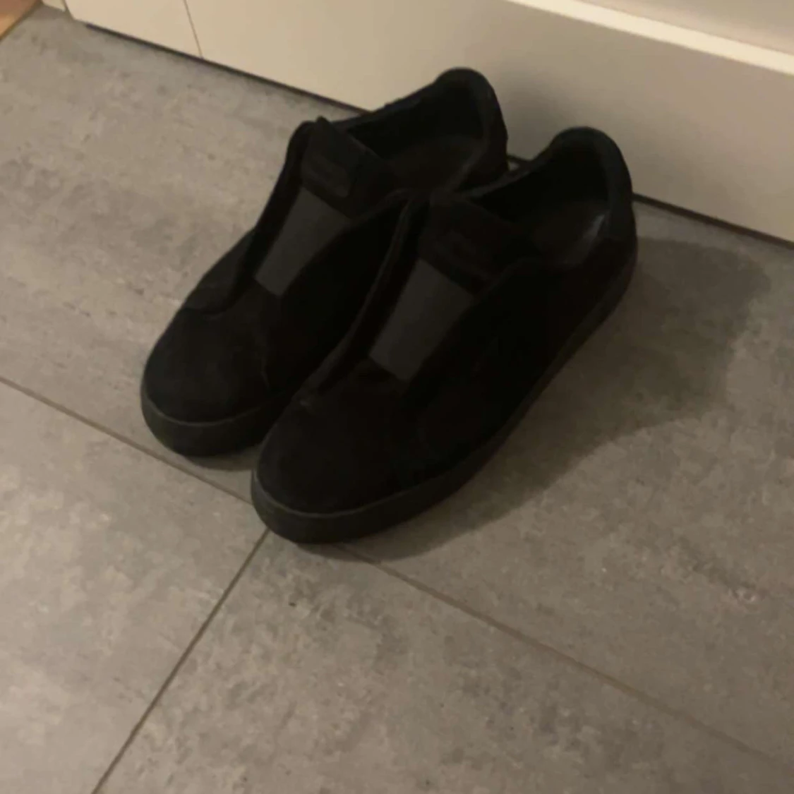 Stilrena svarta slip-on sneakers med ovandel i mocka och elastiska paneler för enkel påtagning. Skorna har en platt sula och rund tå, vilket ger en clean och modern look. Perfekta för dig som gillar minimalistisk stil.