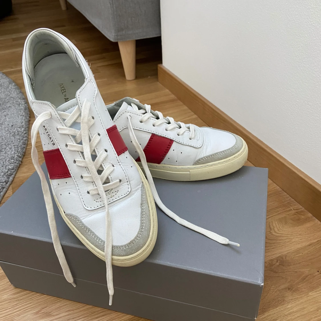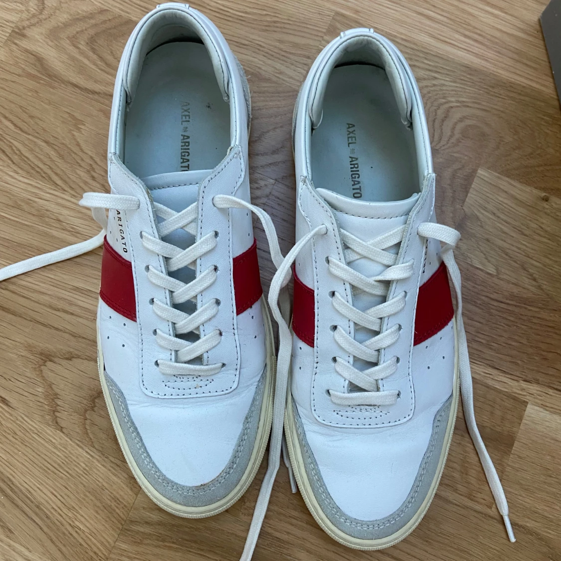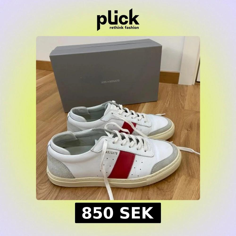 Snygga vita sneakers från Axel Arigato med en röd detalj på sidan. Skorna har snörning och en rund tå. Perfekta för en stilren look. Med skoförpackning ingår även en grå påse med axel arigato märket. Priset kan diskuteras.