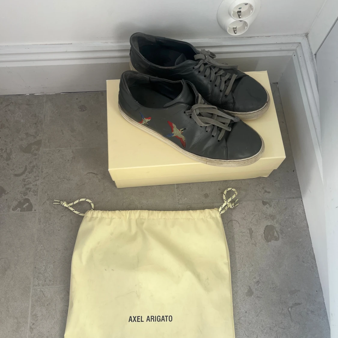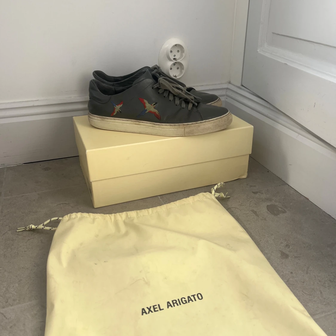 Säljer mina clean 90 Bee bird grey. Vilket är ett par gråa sneakers från Axel Arigato i skinn med färgglada broderade fåglar på sidorna. Klassisk låg modell med snörning och vit platt sula. Skorna levereras med originalpåse och låda. Perfekt för dig som gillar stilrena men unika detaljer. Säljs då de inte används längre. Storlek 43. De är väll använda därefter så lågt pris då nypris är runt 2200