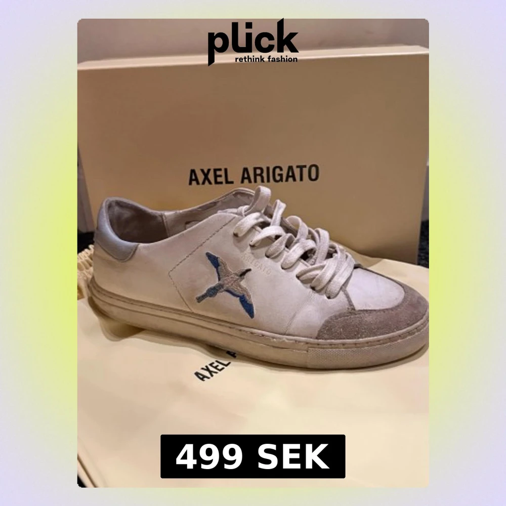 Tjena säljer ett par vita sneakers från Axel Arigato med broderad fågel i blått och grått på sidan. Skorna har en liten reva i mockan på ena skon annars är skon i hyffsar bra skick. Kvitto finns på sista bilden.