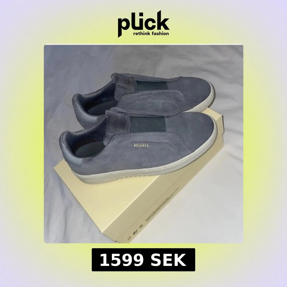 Snygga grå sneakers från Axel Arigato i mocka med vit platt sula och elastiskt band över vristen. Minimalistisk design med guldfärgad logga på sidan. Perfekta för dig som gillar stilrena och moderna skor.