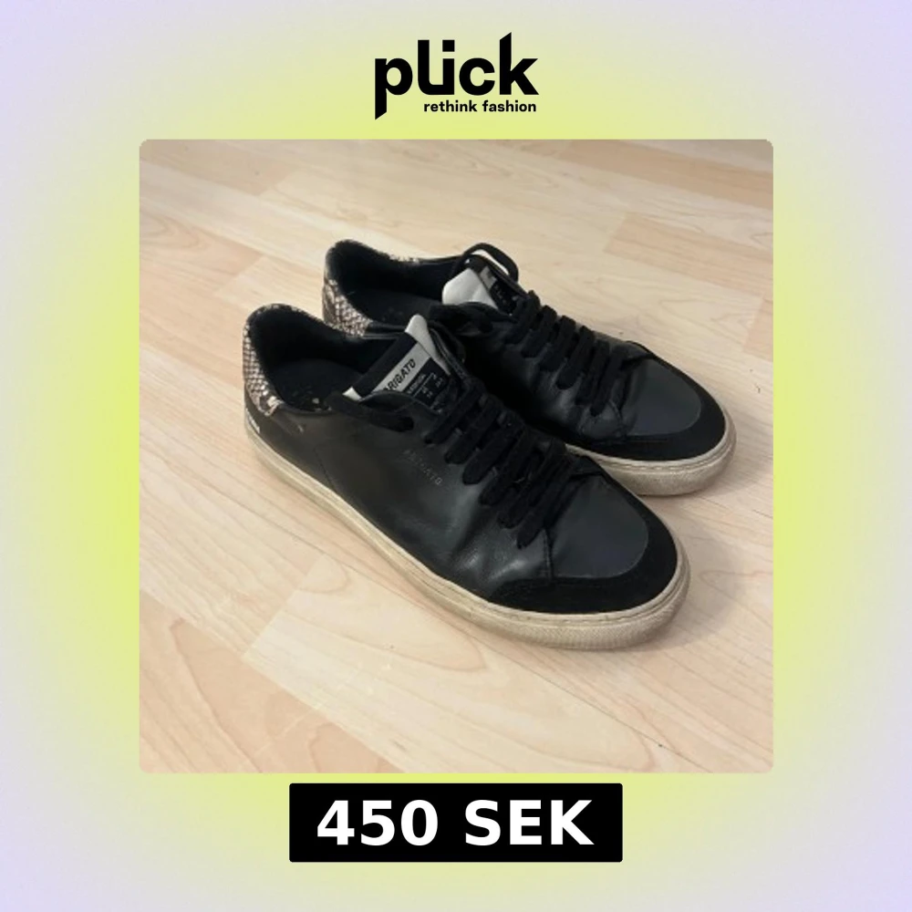 Svarta sneakers från Axel Arigato i skinn med coola detaljer i ormskinnsmönster på hälen. Klassisk låg modell med svarta snören. Perfekta för dig som vill ha en stilren men ändå unik look. Köpta för längesedan så tror inte dom finns kvar, knappt använda så mkt bra skick!! Pris kan diskuteras 💕