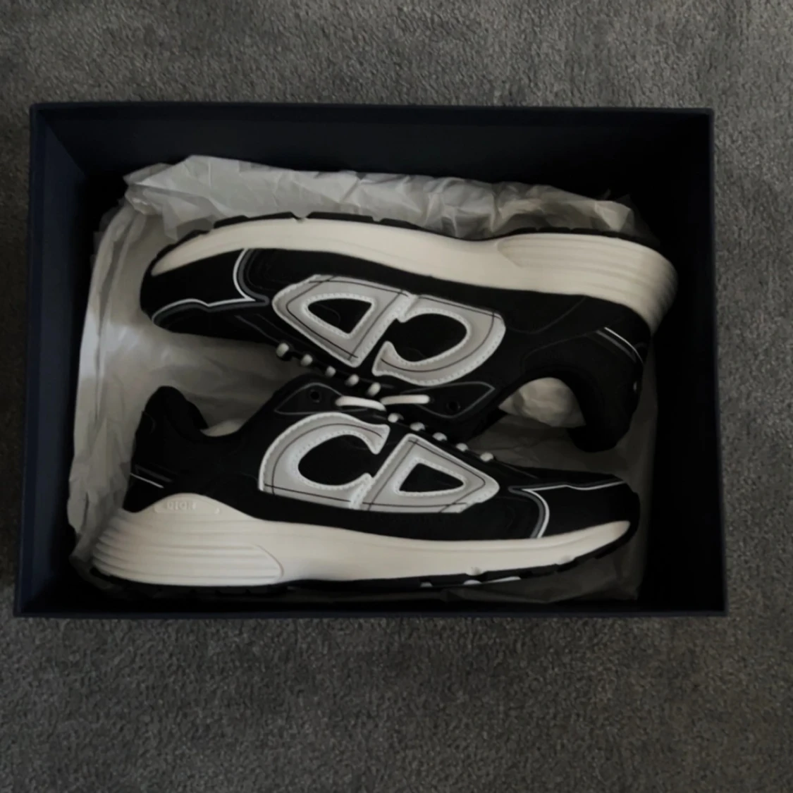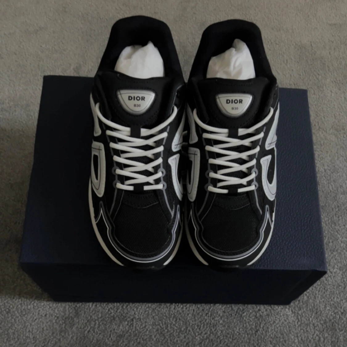 Säljer ett par svart vita b30 sneakers med vita och silvriga detaljer. Skorna har en chunky vit sula och meshpartier för extra andningsförmåga. Klassisk snörning och modern design som sticker ut.